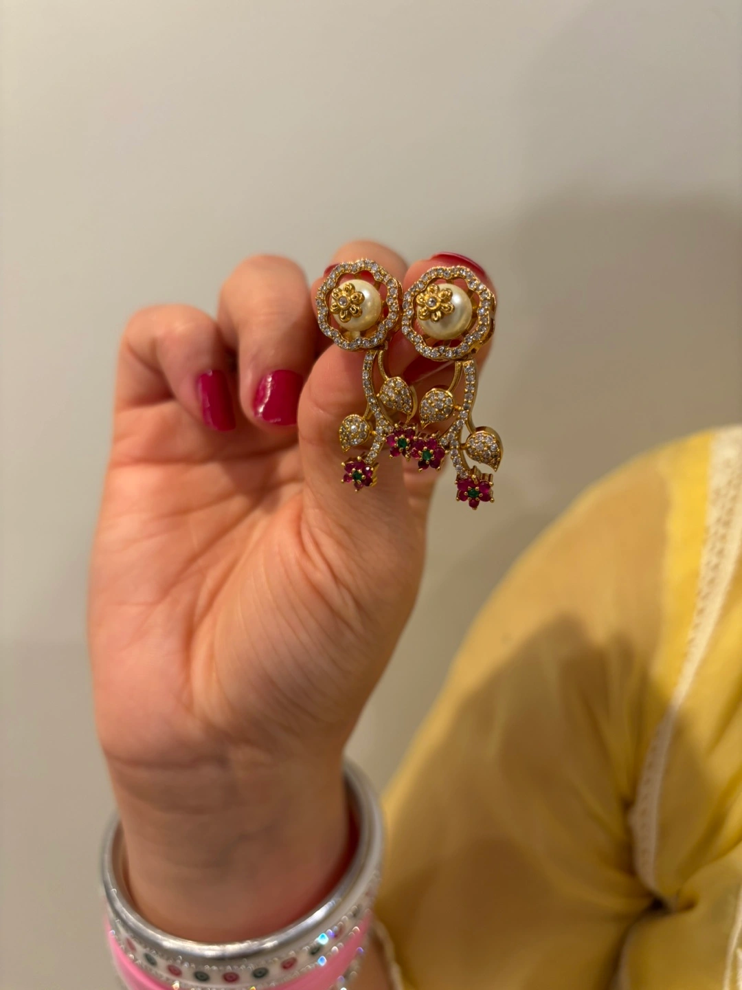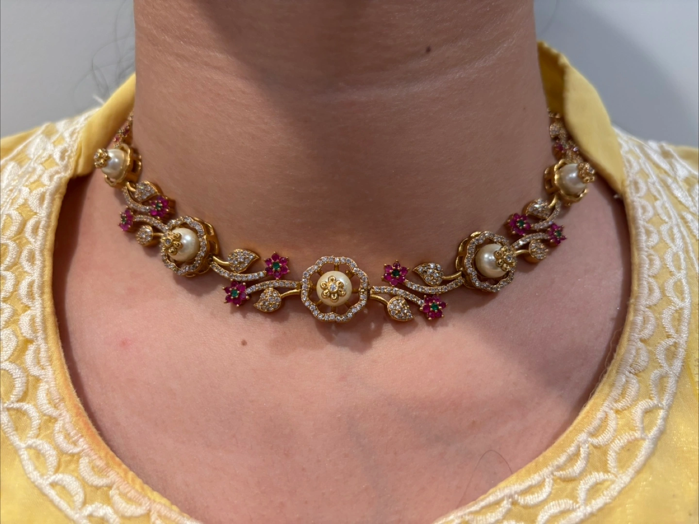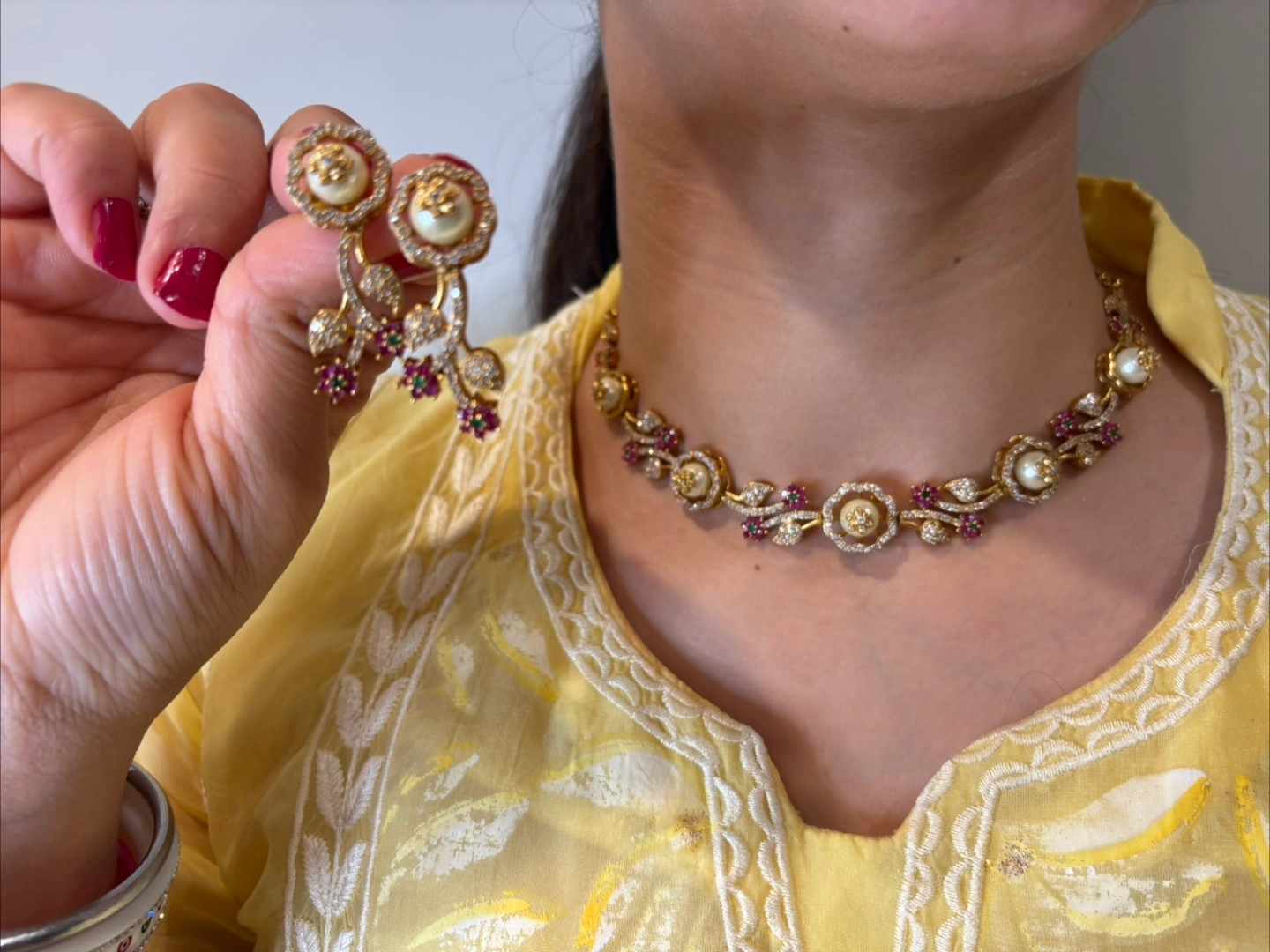 Beautiful necklace and earrings set with pearl and ruby accents. This set is perfect for adding a touch of elegance to any outfit. The intricate floral design is sure to catch the eye!