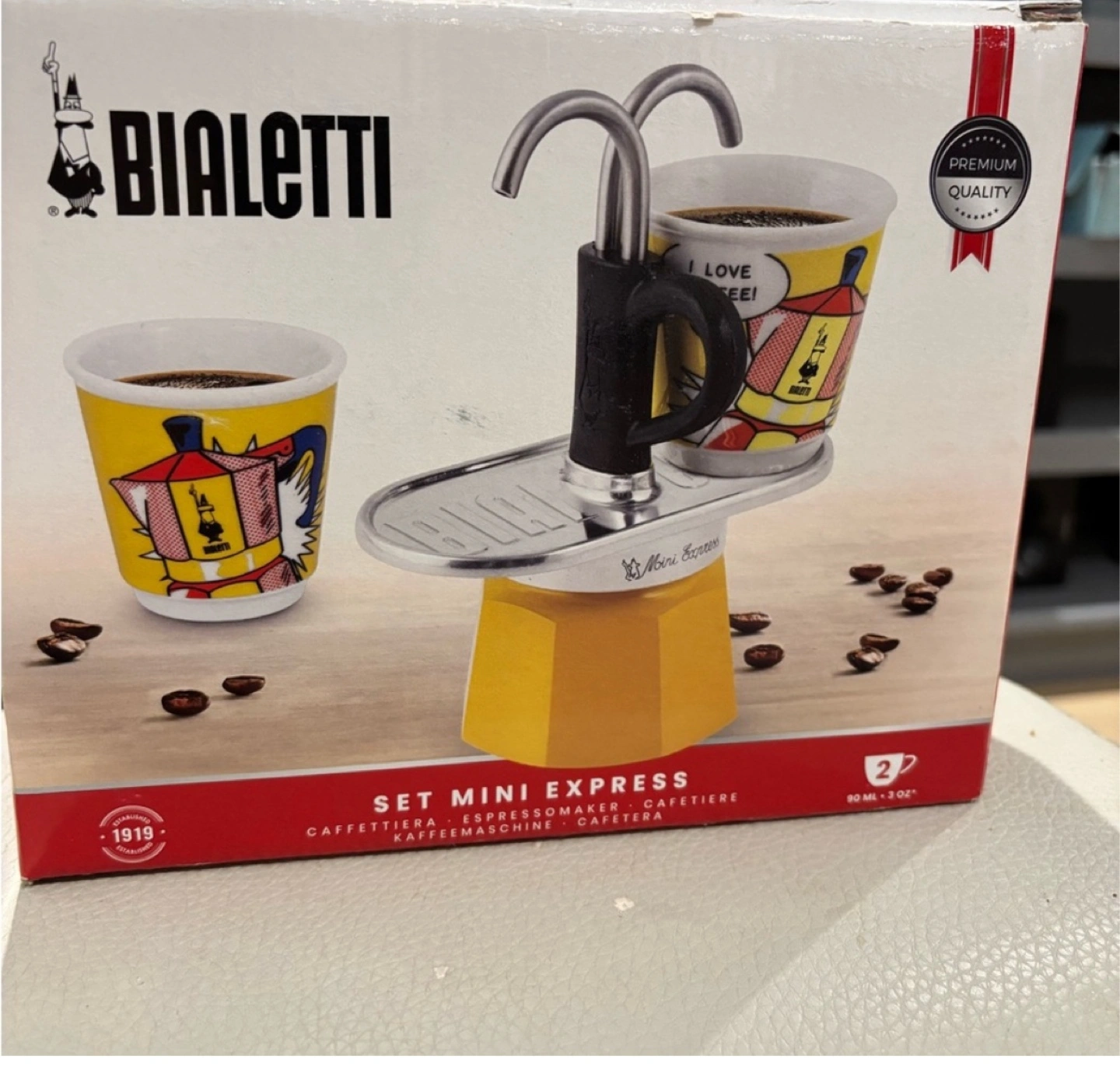 Bialetti / Enjoy a perfect espresso with the Bialetti Mini Express Coffee Maker Set! This stylish black and yellow design is ideal for coffee enthusiasts. Includes two cups and the espresso maker. The box is included and it's in excellent condition!