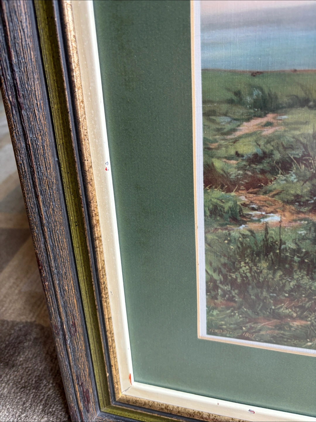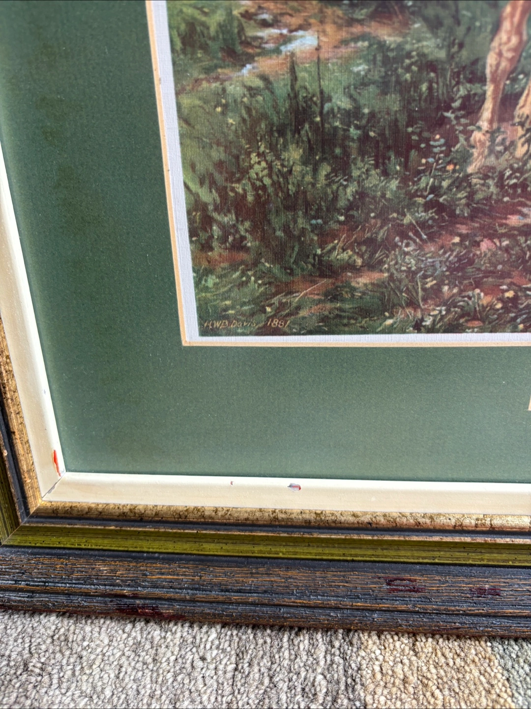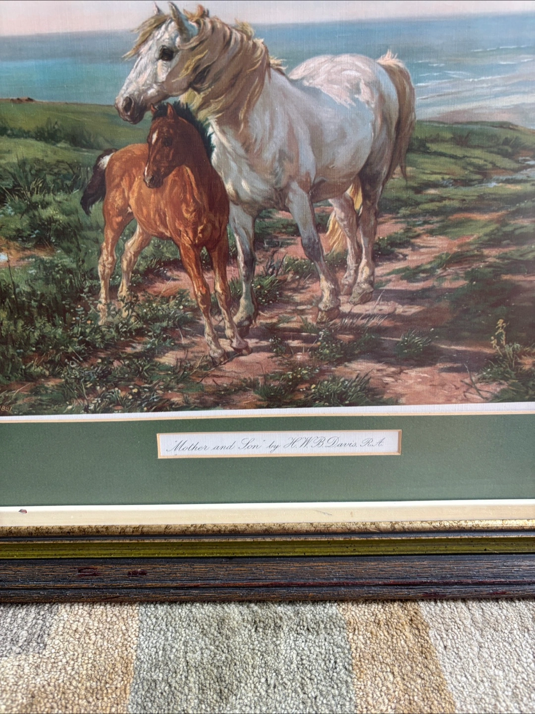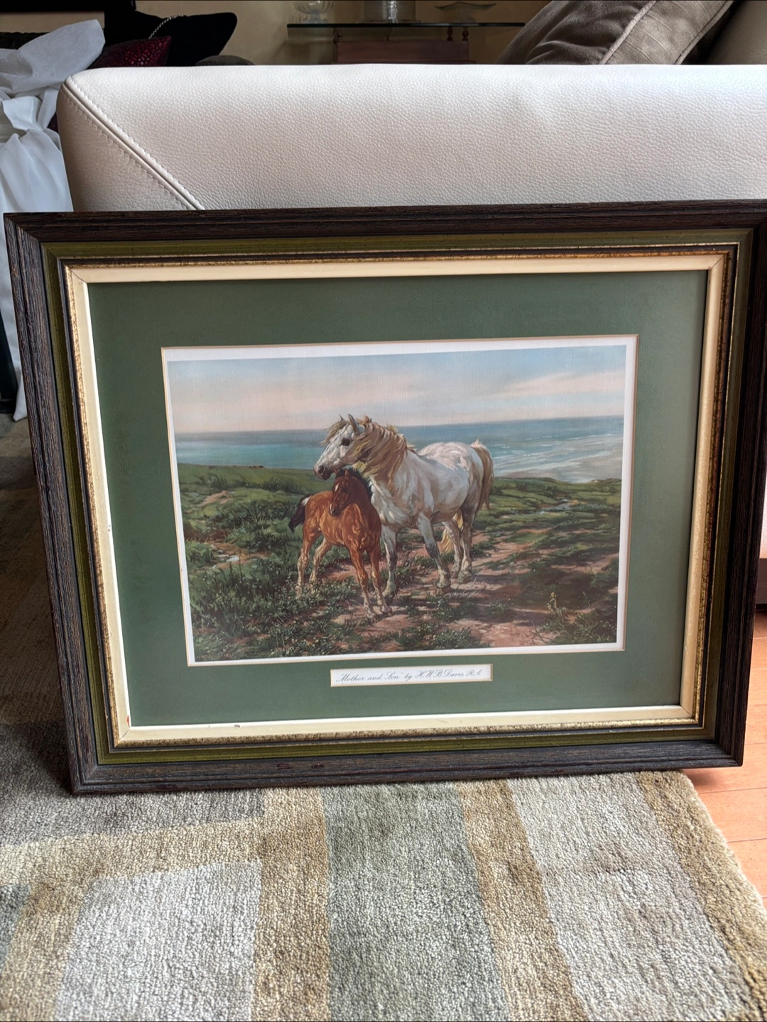 A lovely wood framed print titled "Mother and Son" by H.W.B. Davis R.A. It depicts a serene scene of a mare and her foal by the sea. The frame is in good condition with a few scratches due to its age but still in great condition and ready to hang in your home! It measures 25 inches wide and 21 1/2 high. From a SF and PF home. Pickup only in the St. Lawrence market area of downtown Toronto. Cash only.