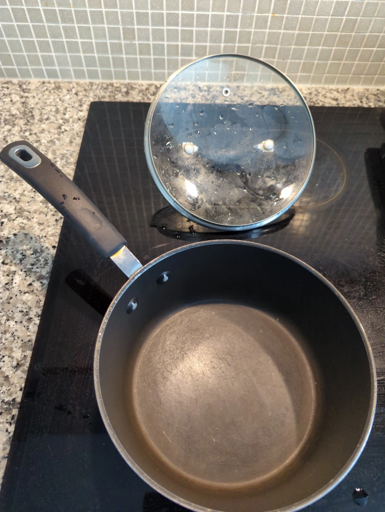 Selling a saucepan with a lid. It looks to be about 6 inches in diameter. It's perfect for small cooking tasks!