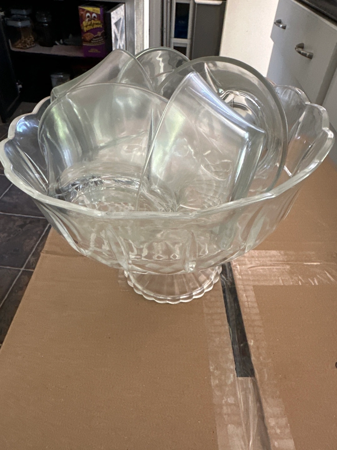 Selling a lovely glass punch bowl with cups. It's perfect for parties or gatherings. The bowl has a beautiful scalloped edge and a sturdy base. The set includes several matching cups.
