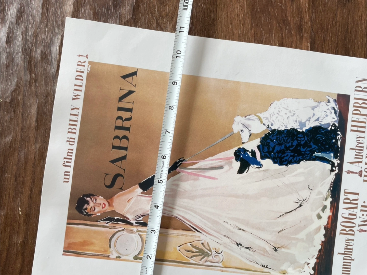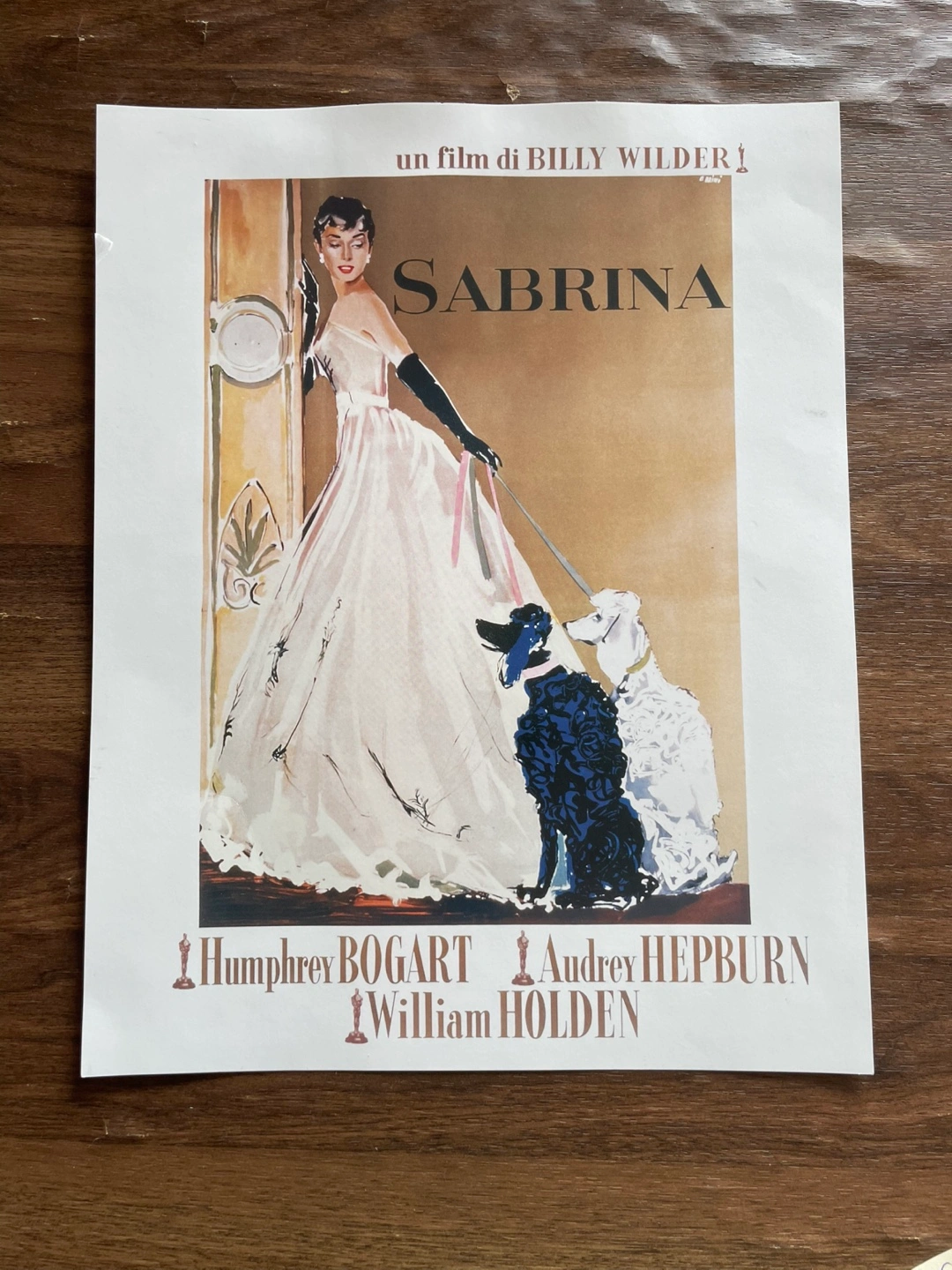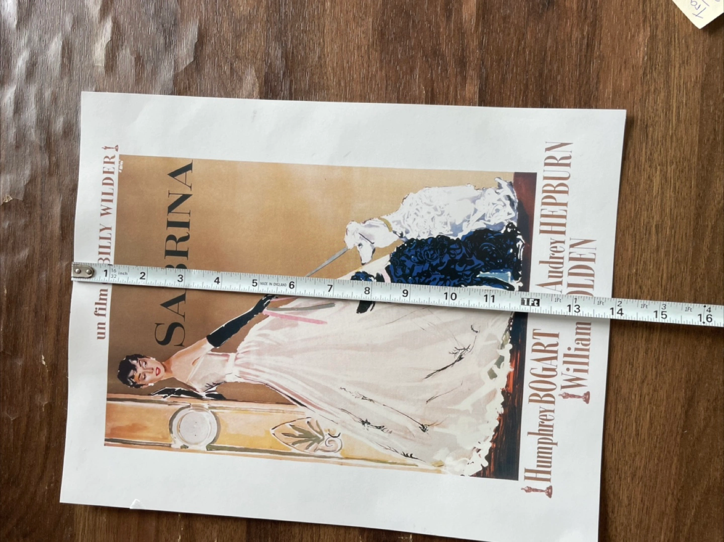 Small poster for the classic movie Sabrina (1954), starring Audrey Hepburn, Humphrey Bogart, and William Holden This is a nice piece for any film buff or fan of classic Hollywood. Good condition but has a small rip on the side as pictured and tape marks on the back. Would look great in a frame Beautifully designed poster featuring a watercolour style painting of Audrey Hepburn and 2 dogs and wearing the famous Givenchy gown she wears in Sabrina. Measures 14x11 inches Pick up near Yonge and eglinton