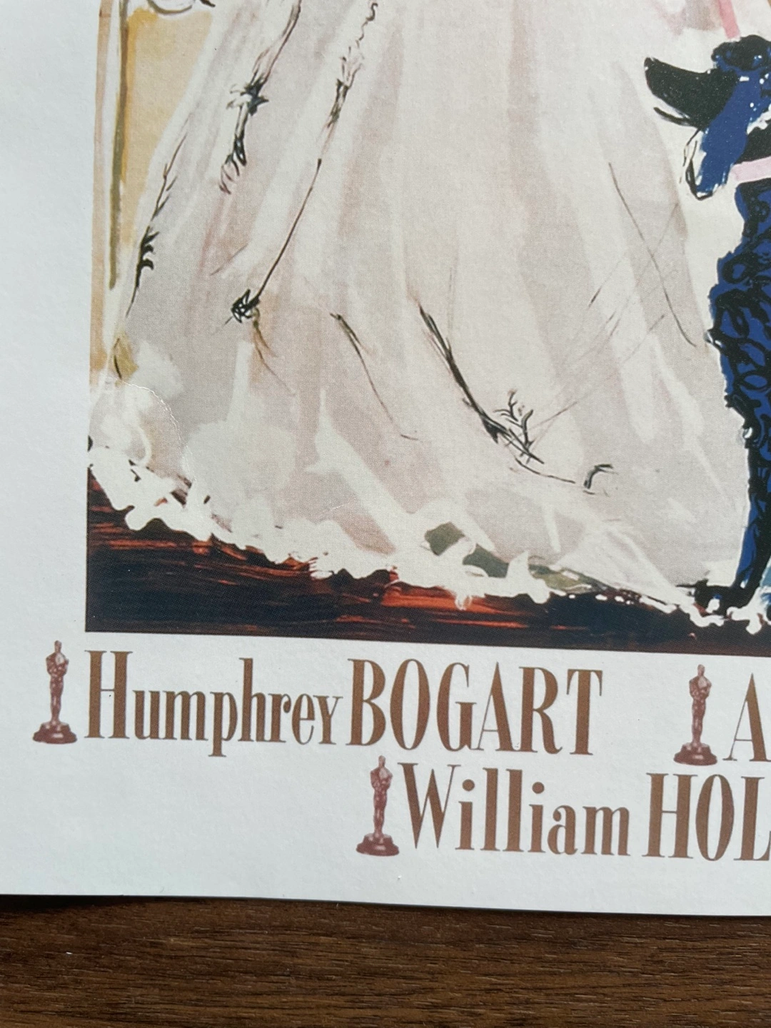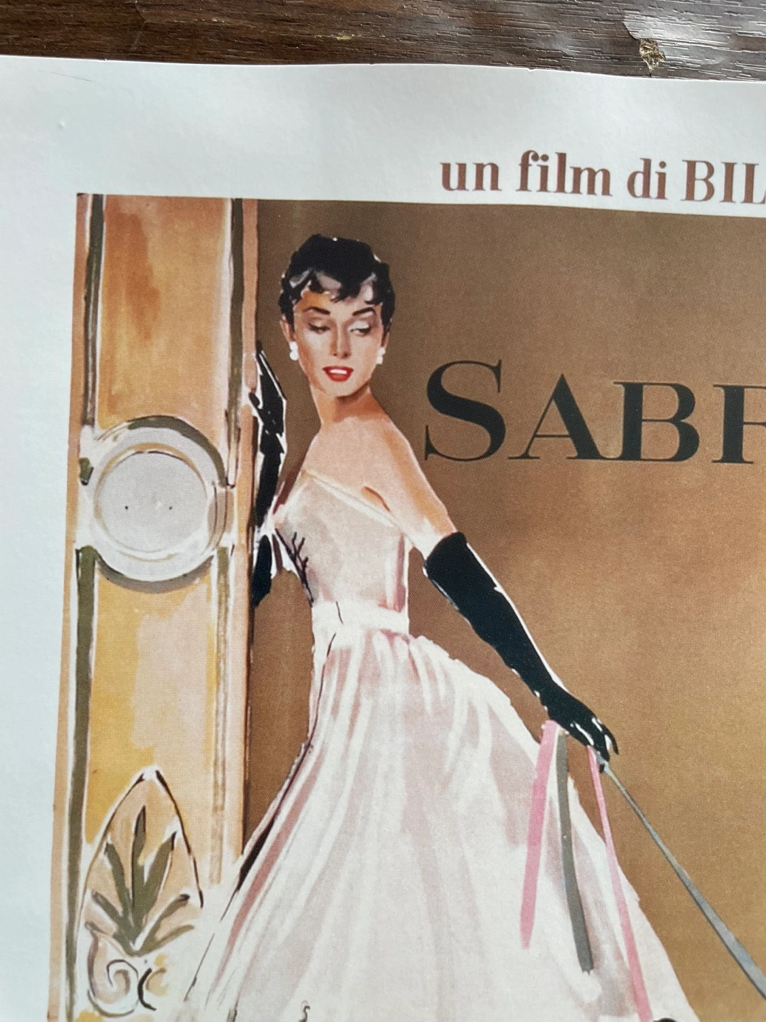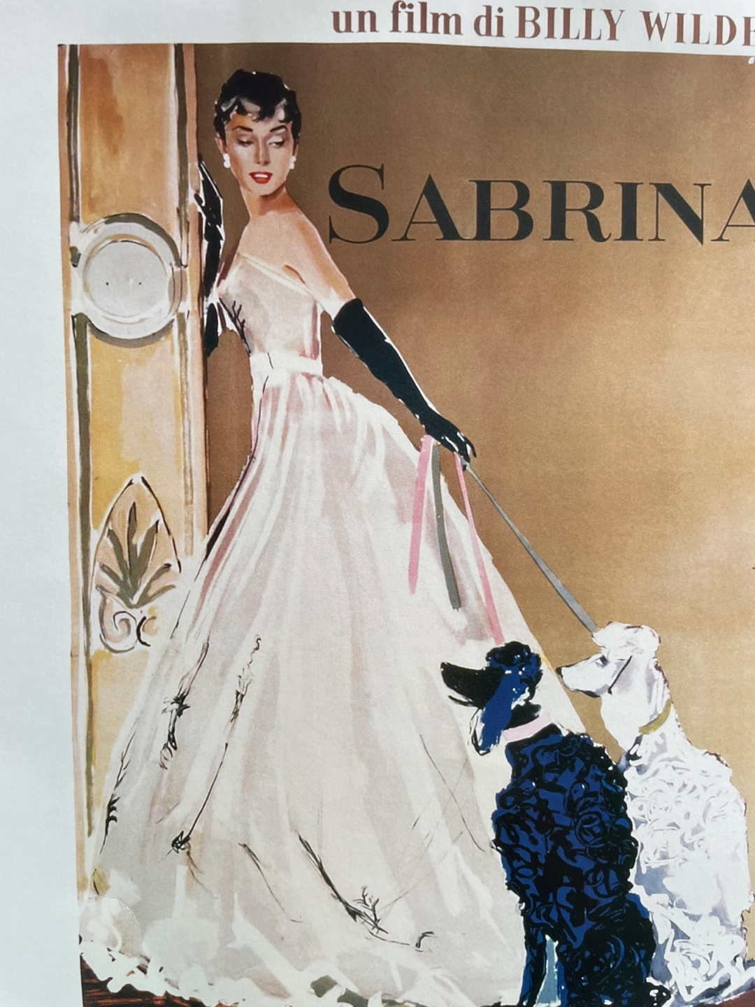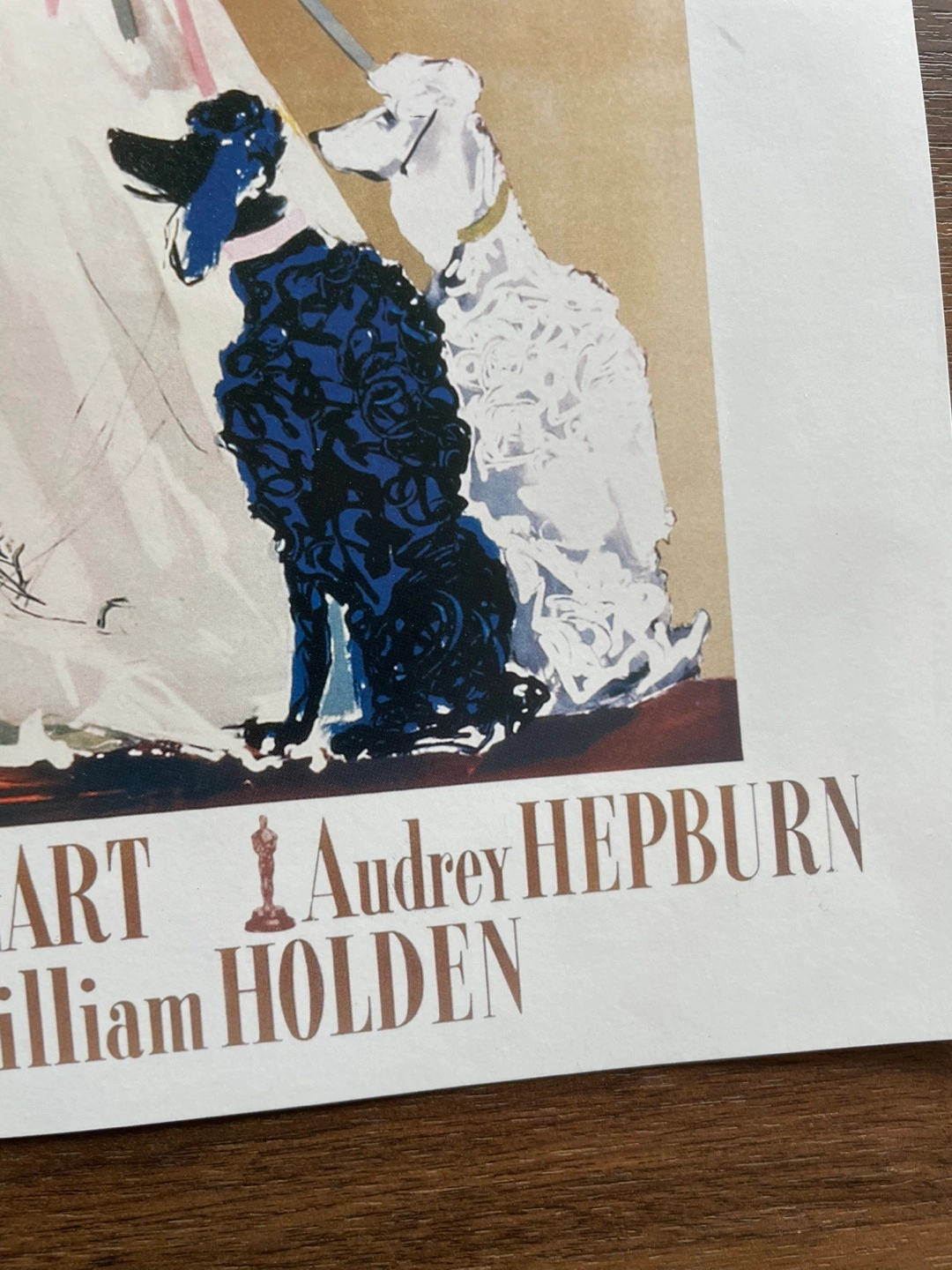 Small poster for the classic movie Sabrina (1954), starring Audrey Hepburn, Humphrey Bogart, and William Holden This is a nice piece for any film buff or fan of classic Hollywood. Good condition but has a small rip on the side as pictured and tape marks on the back. Would look great in a frame Beautifully designed poster featuring a watercolour style painting of Audrey Hepburn and 2 dogs and wearing the famous Givenchy gown she wears in Sabrina. Measures 14x11 inches Pick up near Yonge and eglinton