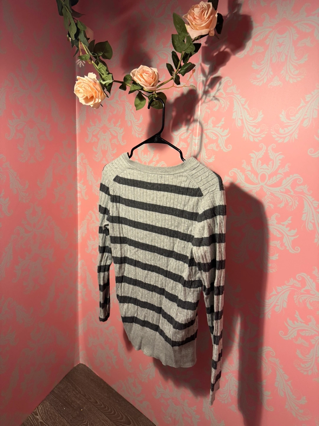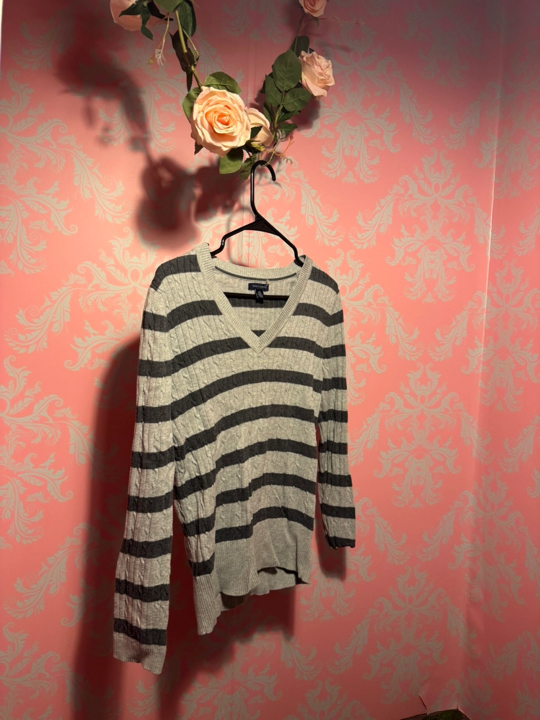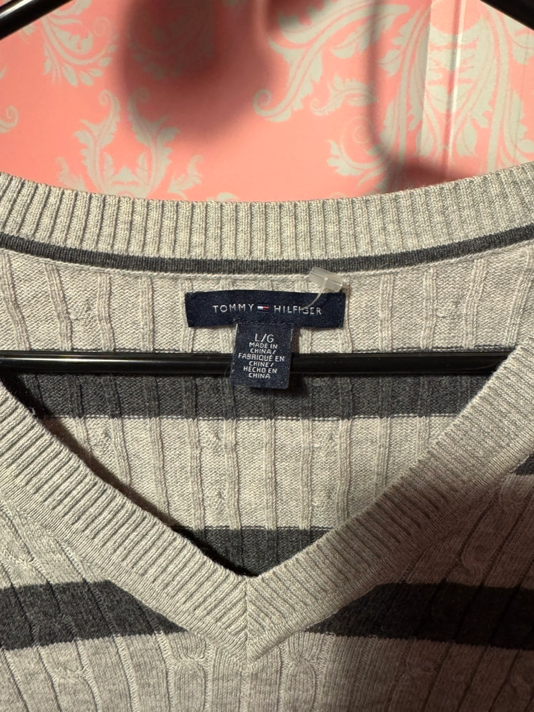 Cozy Tommy Hilfiger striped sweater in size L. It's a V-neck style and features a classic cable knit pattern. Perfect for layering or wearing on its own!