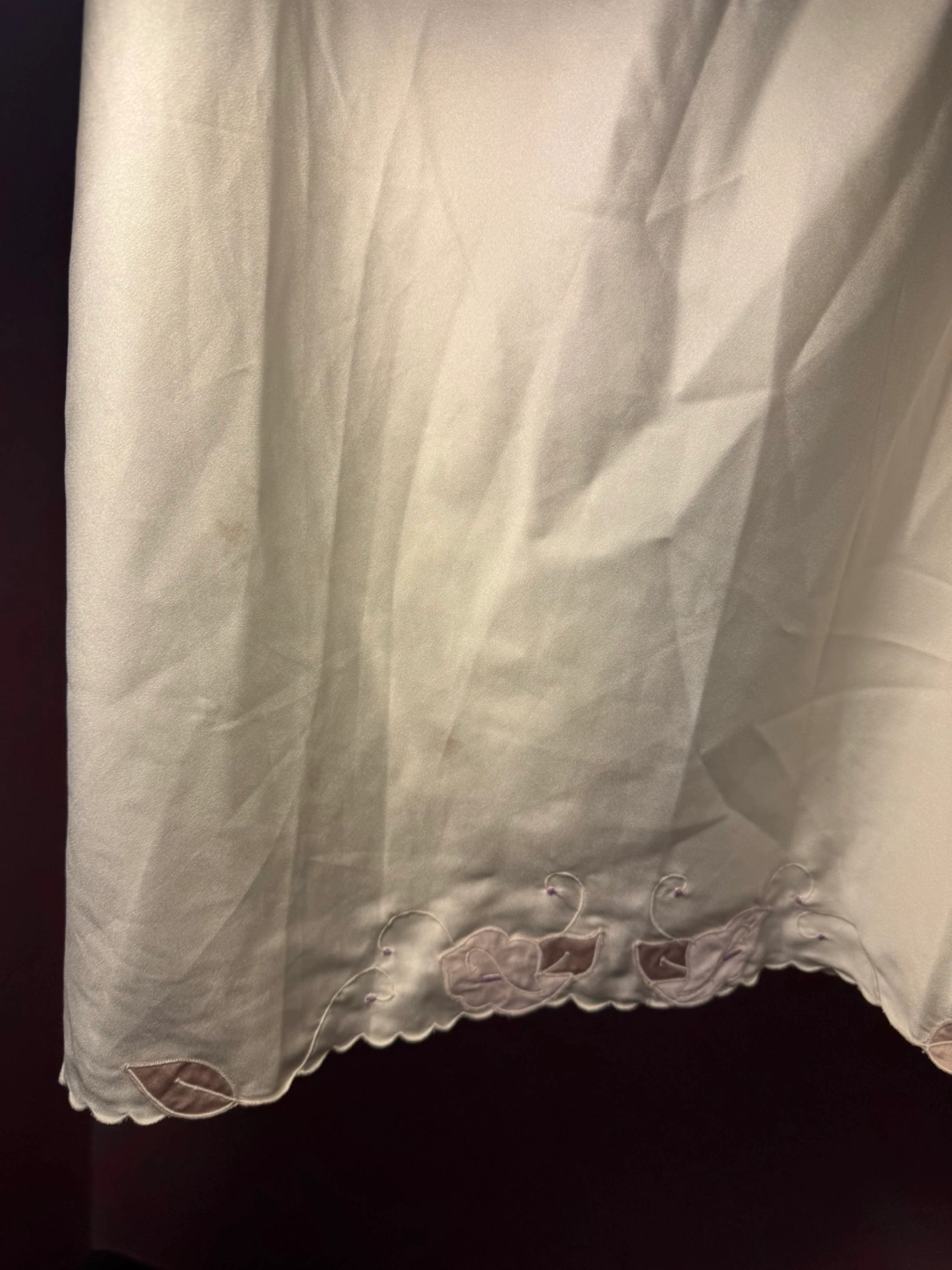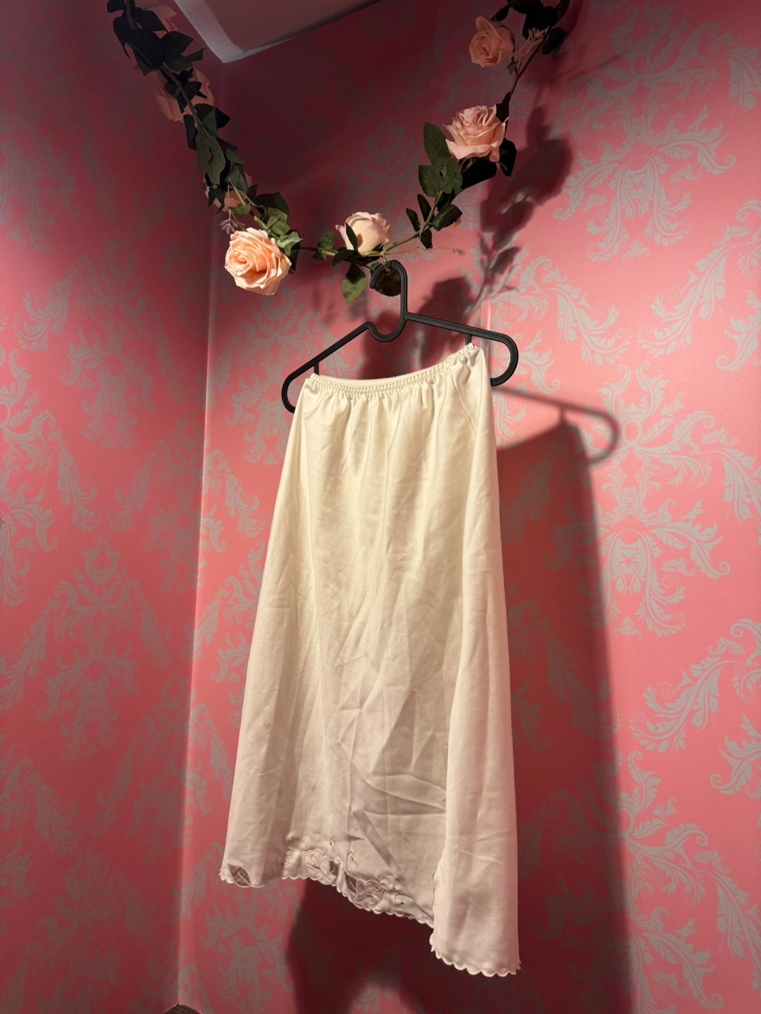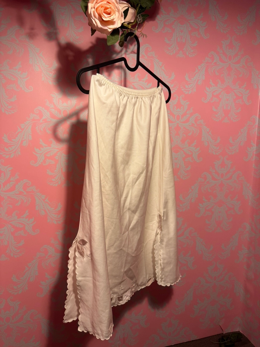 Selling a white slip skirt! It's in great condition and perfect for layering or wearing on its own. The skirt has a delicate scalloped hem with leaf detailing, adding a touch of elegance
