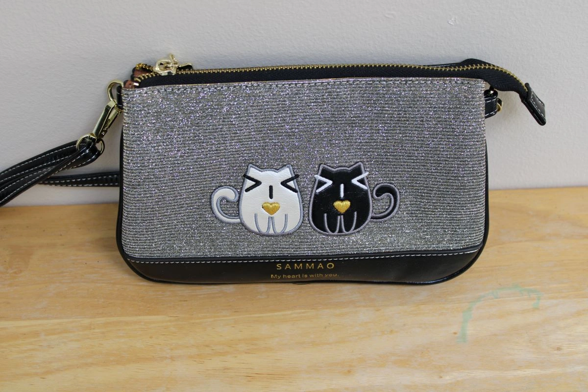 Cute SAMMAO crossbody bag featuring an adorable cat design! The bag has a silver glittery body with a black base and strap. It's in great condition and perfect for adding a touch of whimsy to your outfit! Cash only.