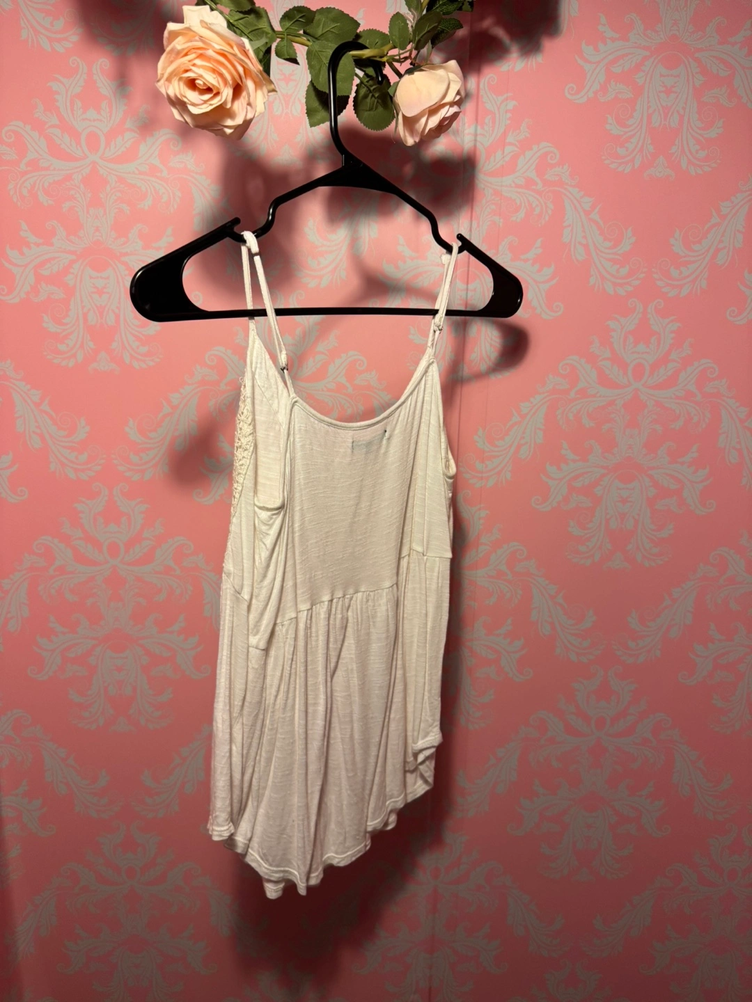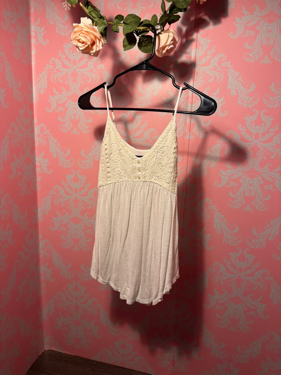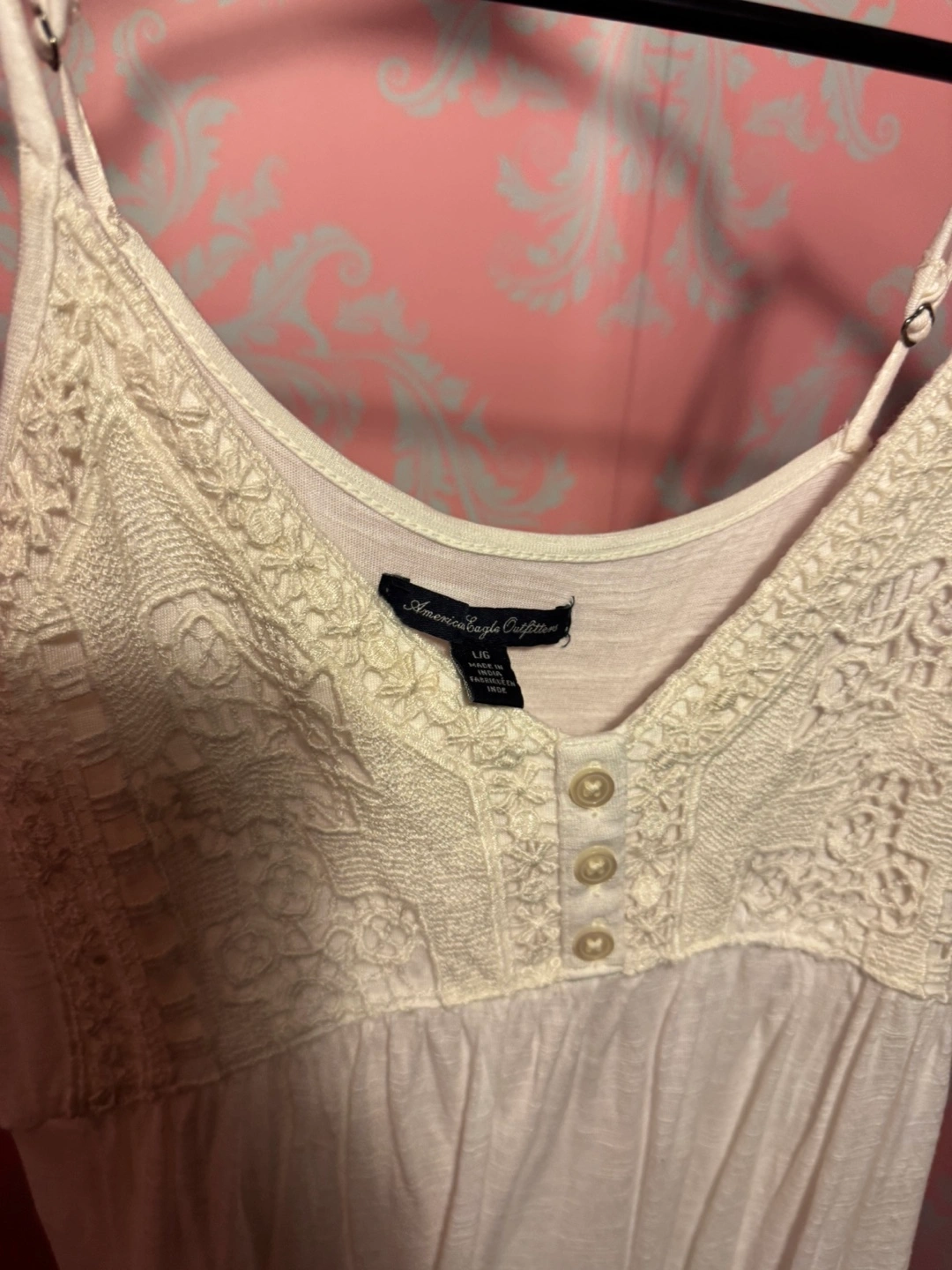 Selling a cute American Eagle Outfitters tank top in size large! It's white and features a lovely lace design on the upper part. Perfect for summer days or layering!