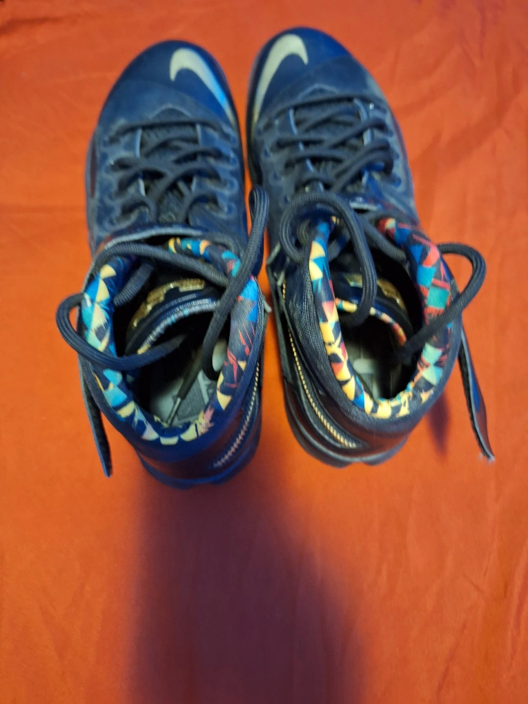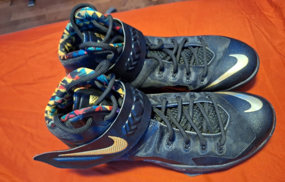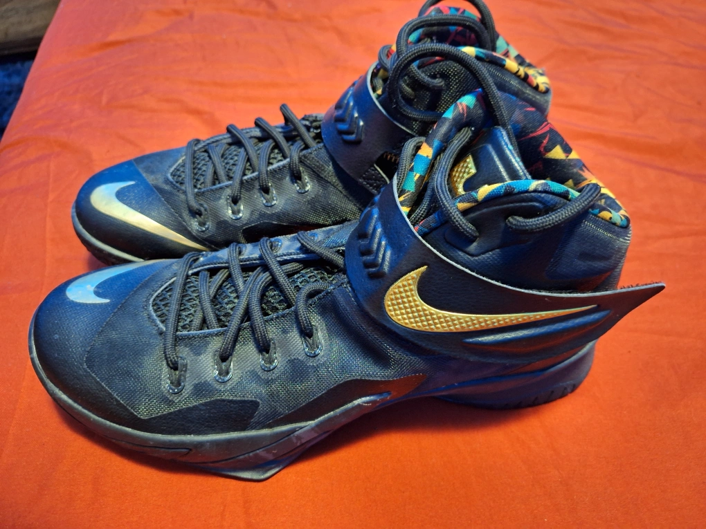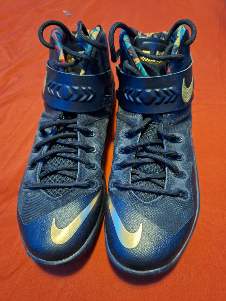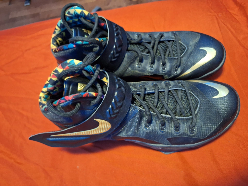 Selling a pair of Nike LeBron Soldier VIII basketball shoes. They are black with gold swooshes and colourful detailing around the ankle. Great for hitting the court or just rocking a sporty look!