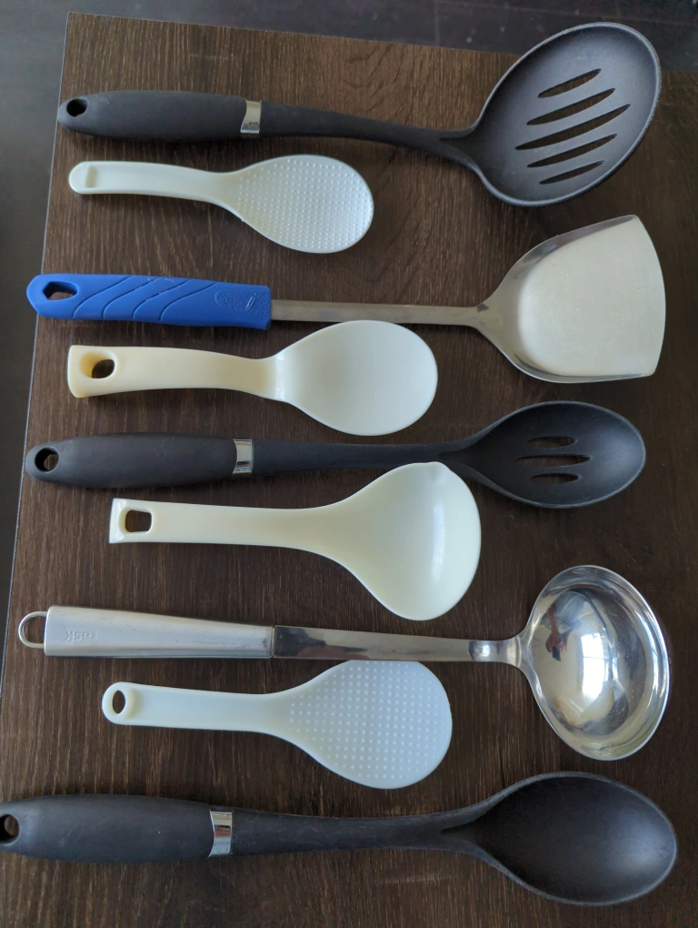 Selling a set of assorted kitchen utensils. Includes a variety of spoons, ladles, and spatulas in different materials and colours. Perfect for equipping a new kitchen or replacing worn-out tools!