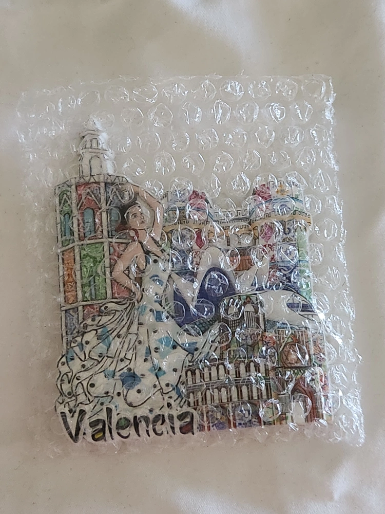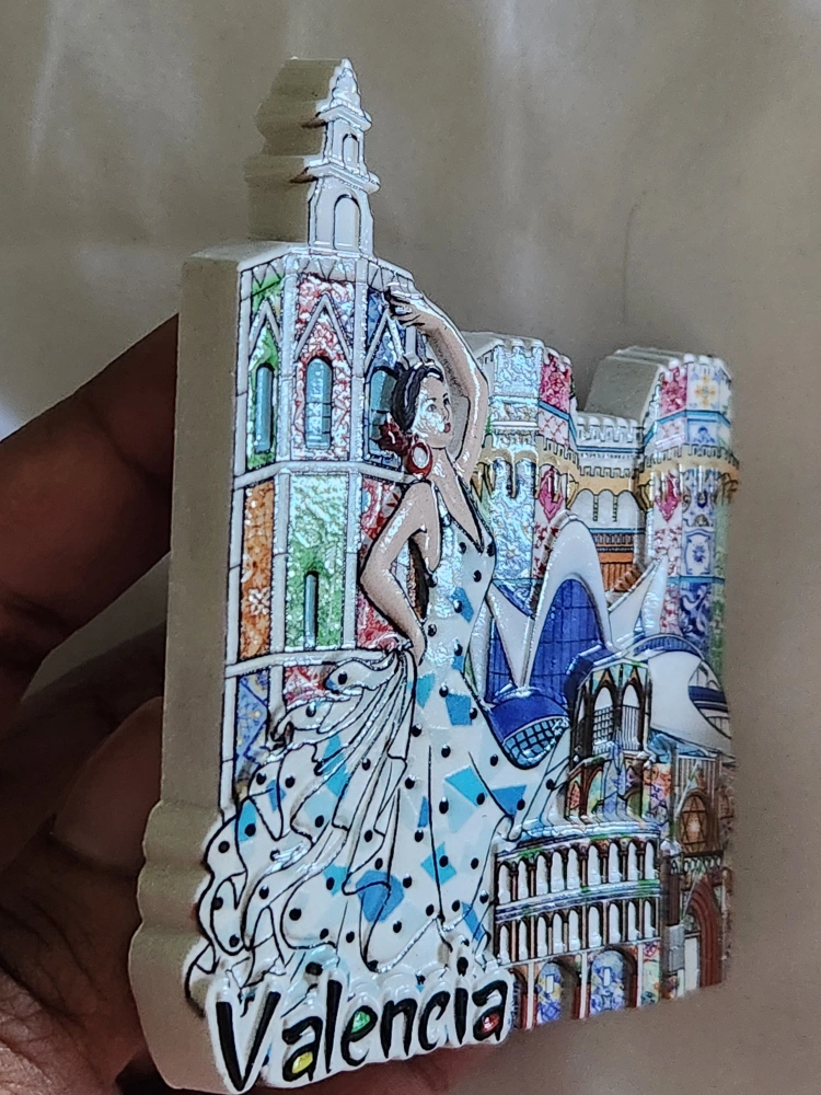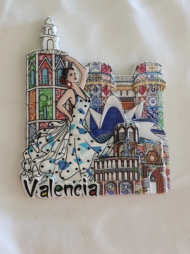 3D Souvenir magnet of Valencia, Spain. Features a woman in a polka dot dress and the city skyline. Great condition!