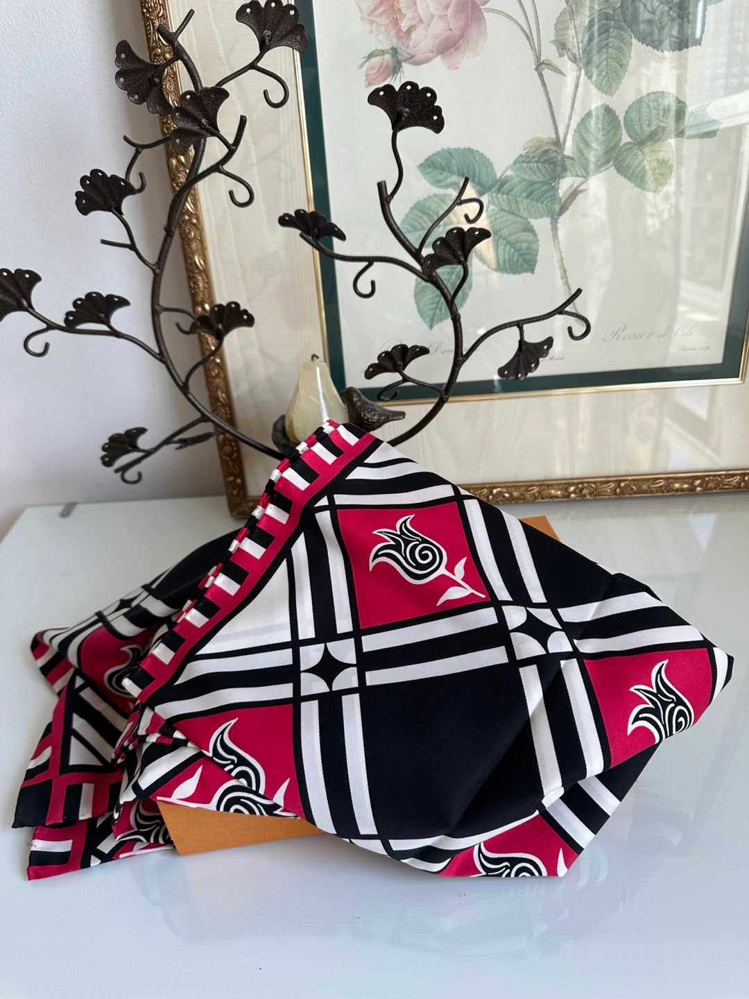 A very stylish scarf with a unique red, black, and white pattern. It's in great condition and ready to add a pop of colour to your wardrobe!