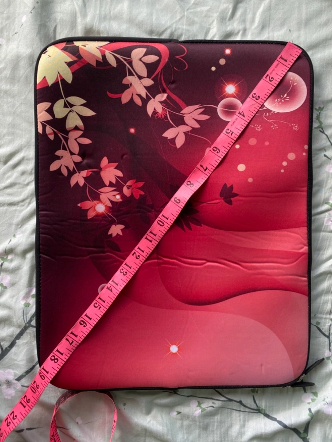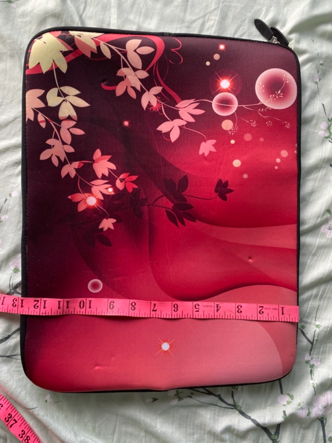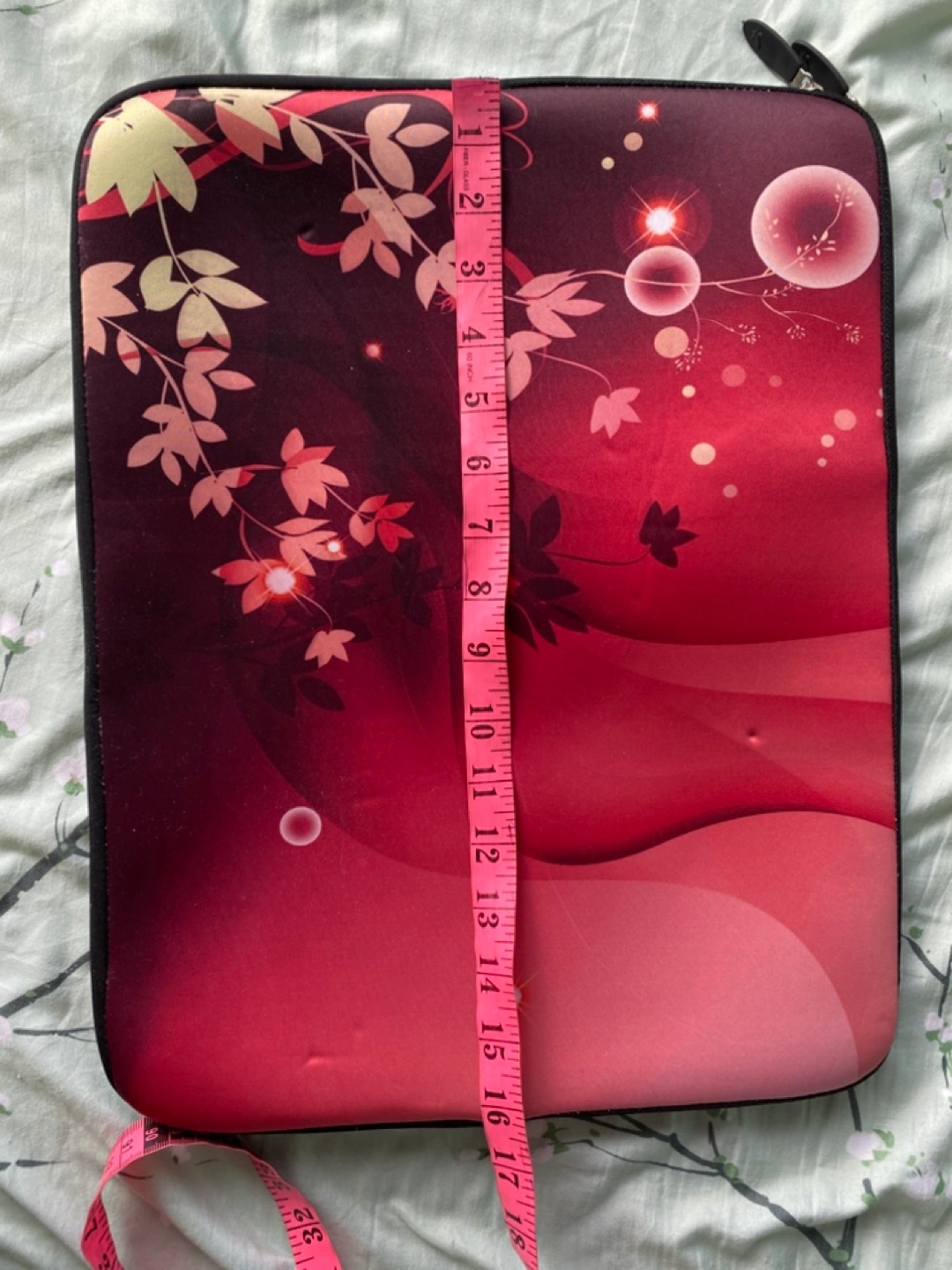 Laptop sleeve in good condition. It features a floral design in shades of red. The sleeve measures approximately 13 inches by 17 inches.