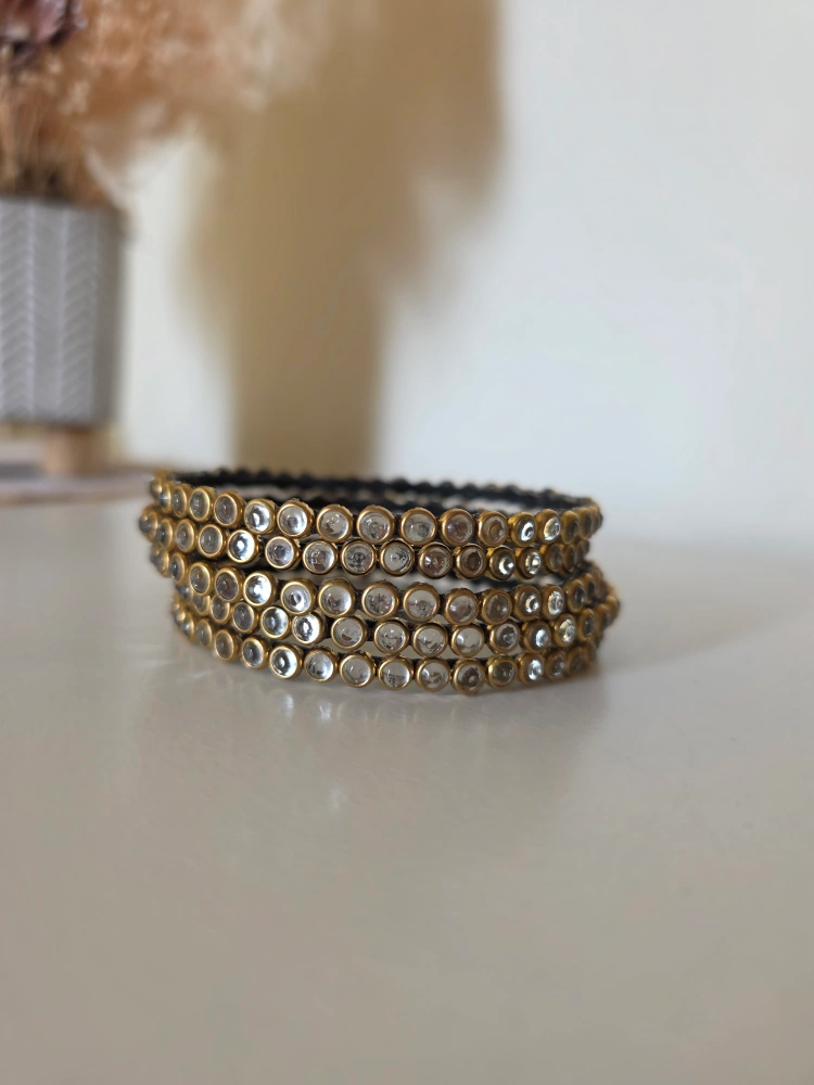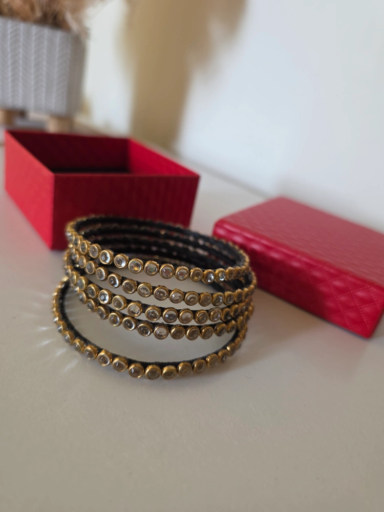 Selling a set of five kundan bangles. Comes with a red box for storage or gifting! New and unused. Size 2.