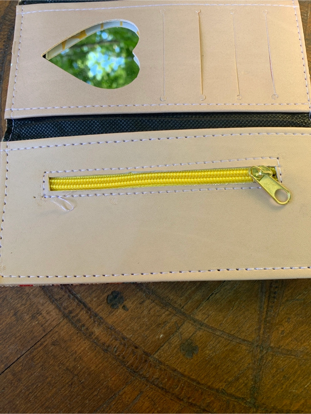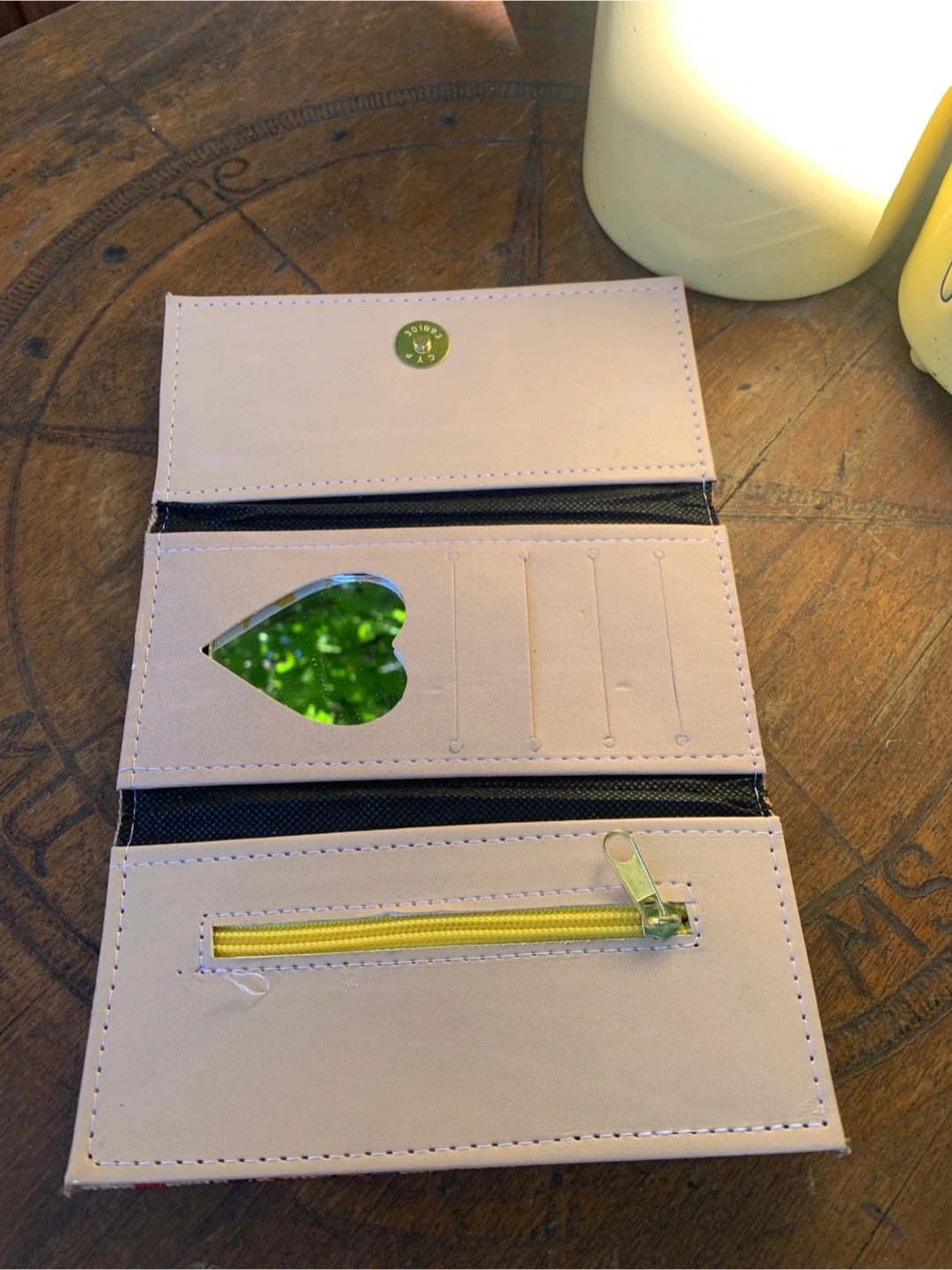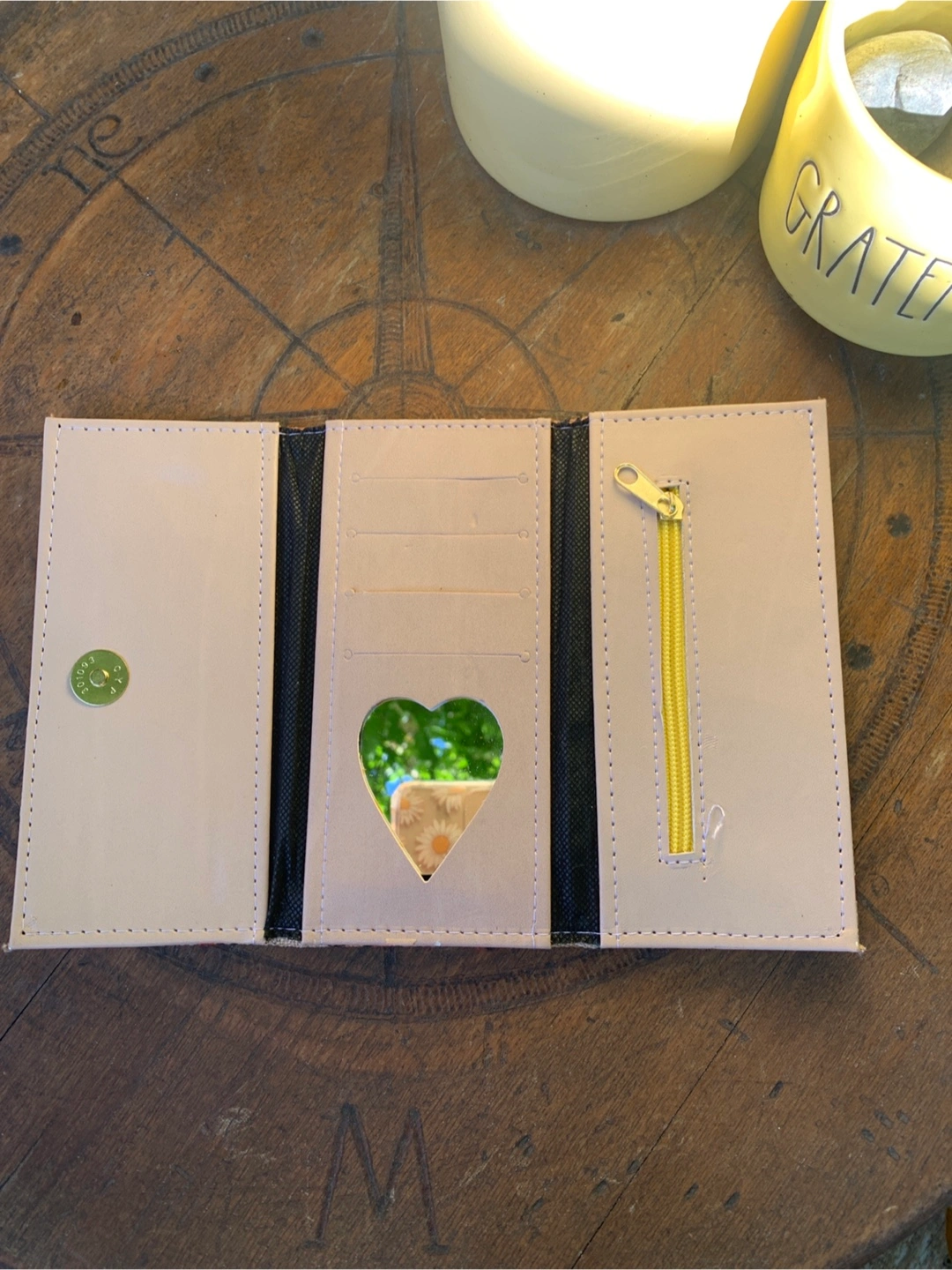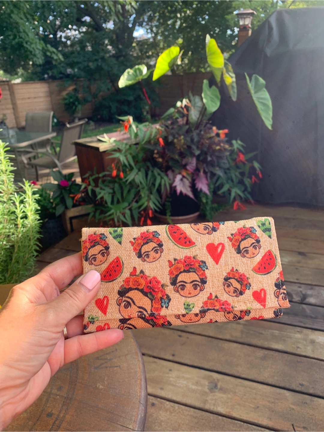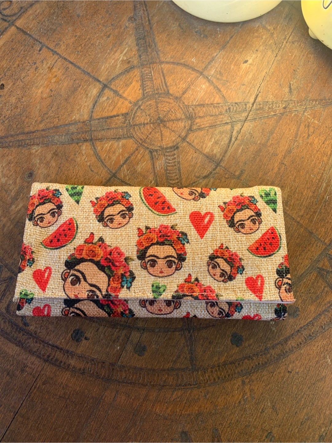 This is a cute wallet with a Frida Kahlo inspired design. The outside of the wallet is made of material and inside is a wipeable man made material. It has a heart-shaped cutout mirror and a zippered coin pouch inside. It has two slide pockets as well for cash. Perfect for carrying your cards and cash! Cash only please. Props not included.