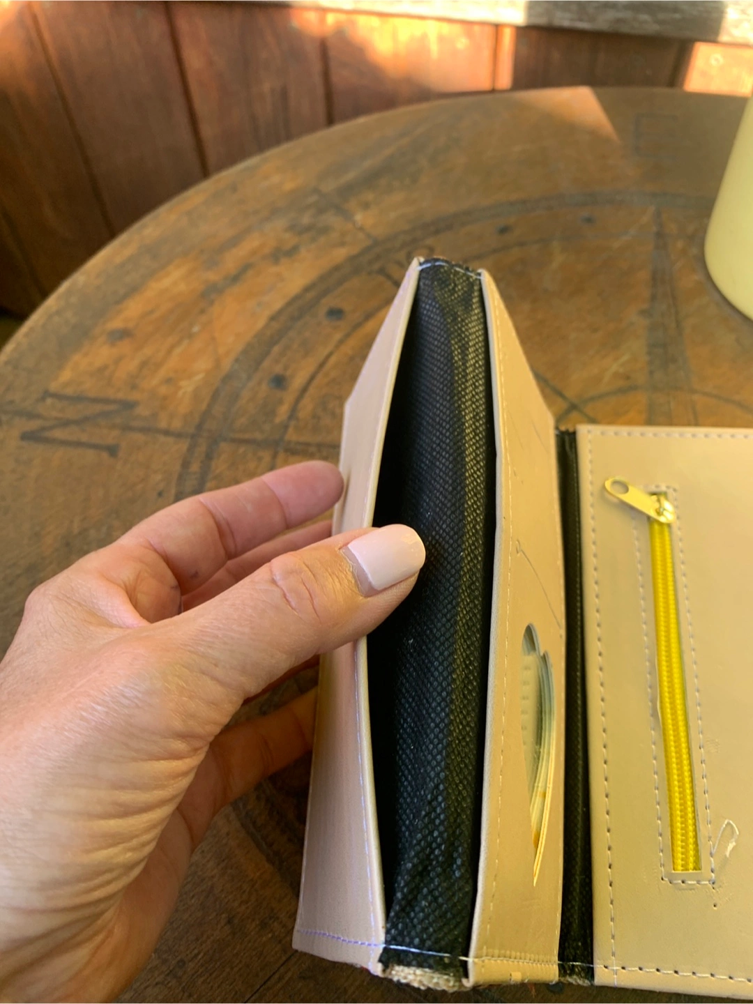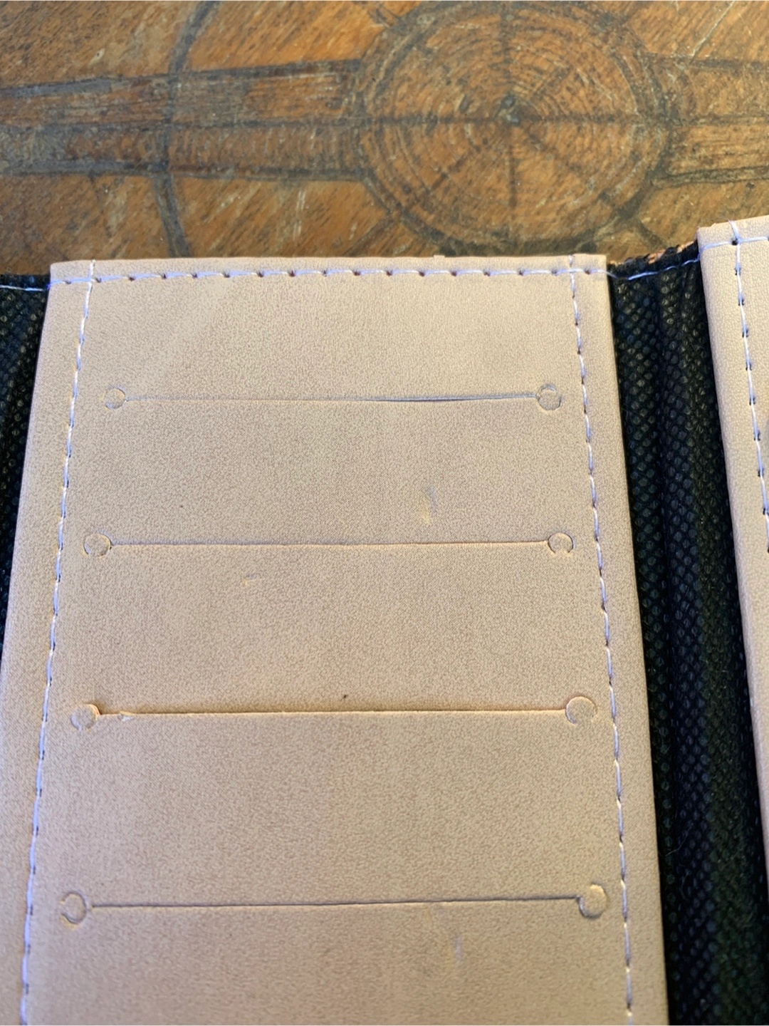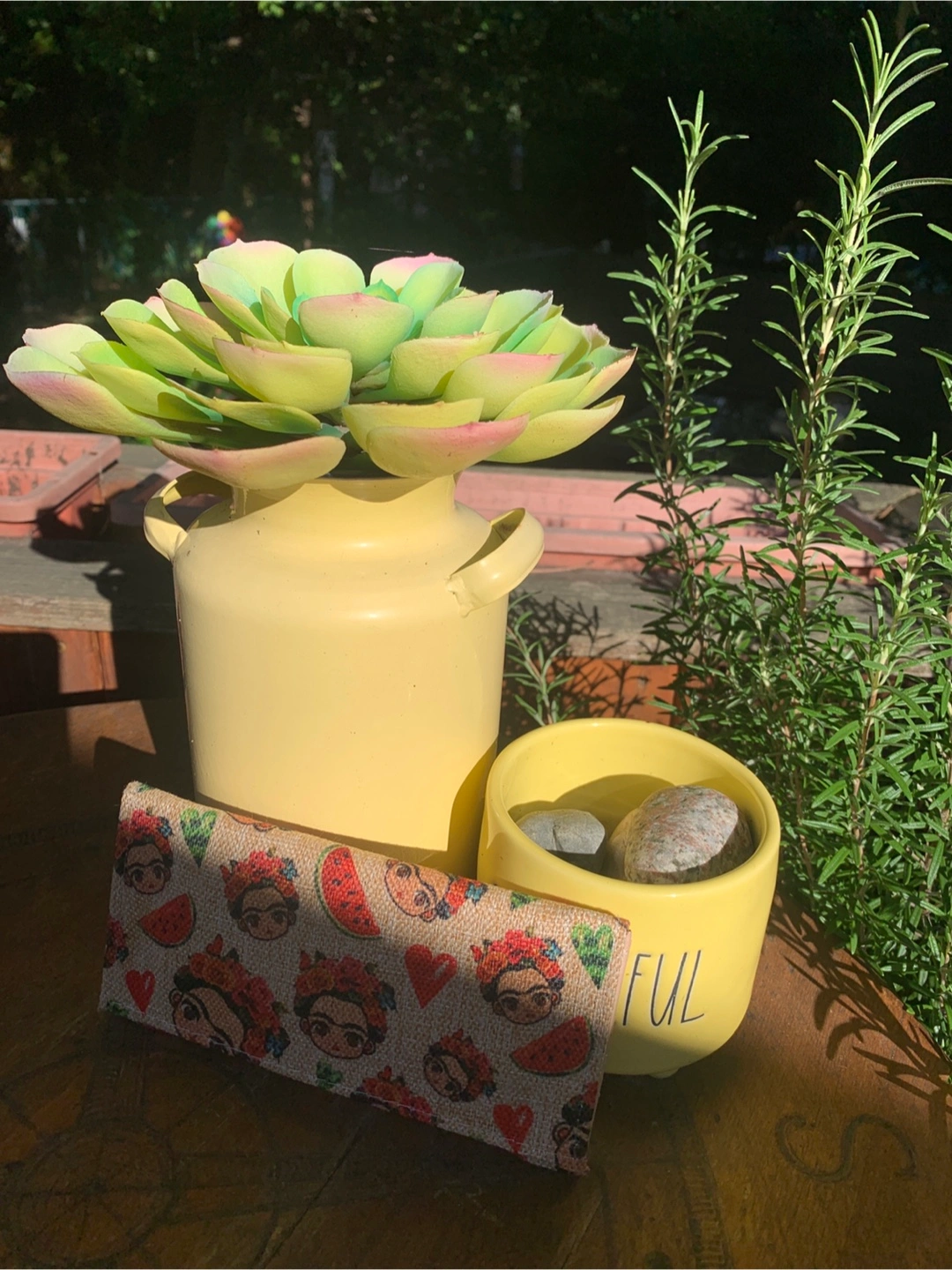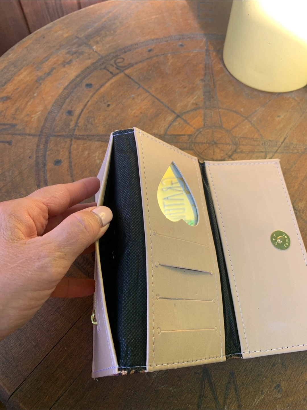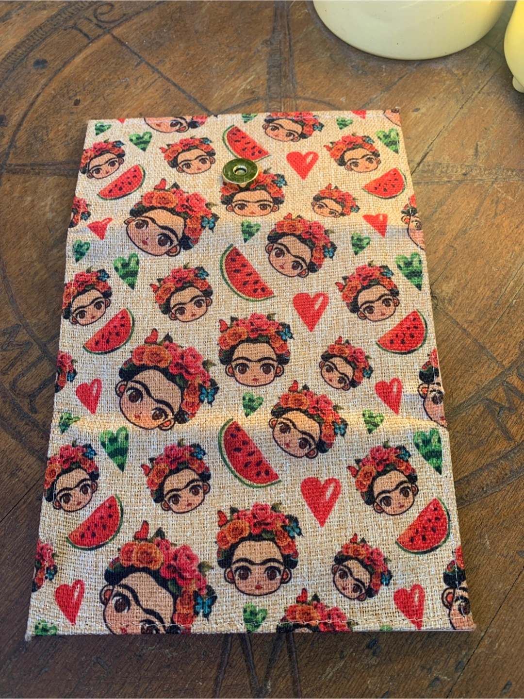 This is a cute wallet with a Frida Kahlo inspired design. The outside of the wallet is made of material and inside is a wipeable man made material. It has a heart-shaped cutout mirror and a zippered coin pouch inside. It has two slide pockets as well for cash. Perfect for carrying your cards and cash! Cash only please. Props not included.
