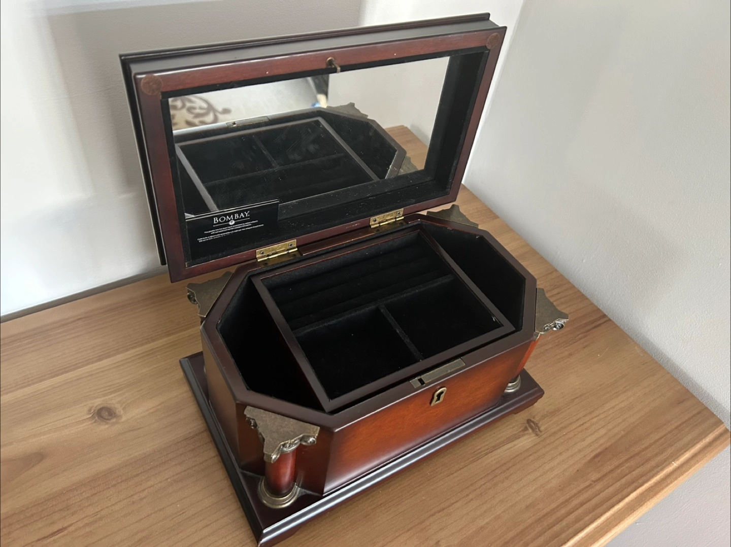 Here's a lovely Bombay jewellery box! It's in great condition and has a beautiful dark wood finish. The interior is lined with soft felt, perfect for keeping your precious items safe and scratch-free. It also features a mirror inside the lid.