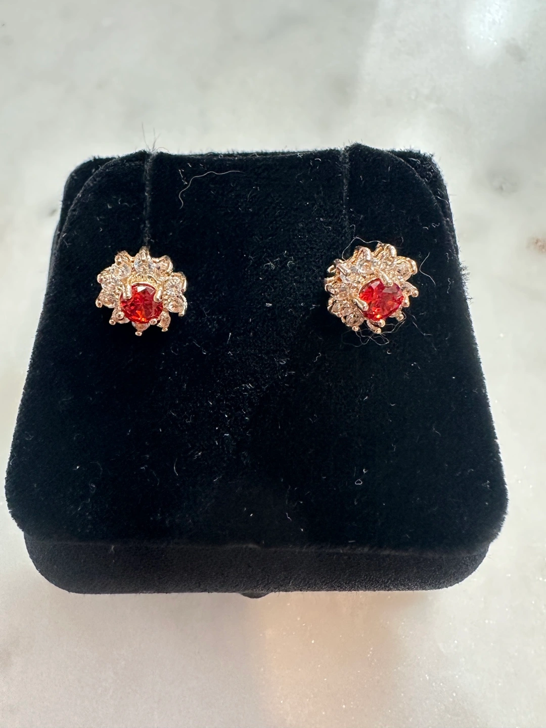 These are a pair of beautiful stud earrings featuring a red gemstone surrounded by smaller clear stones. They are in great condition and ready to add a touch of sparkle to your look!