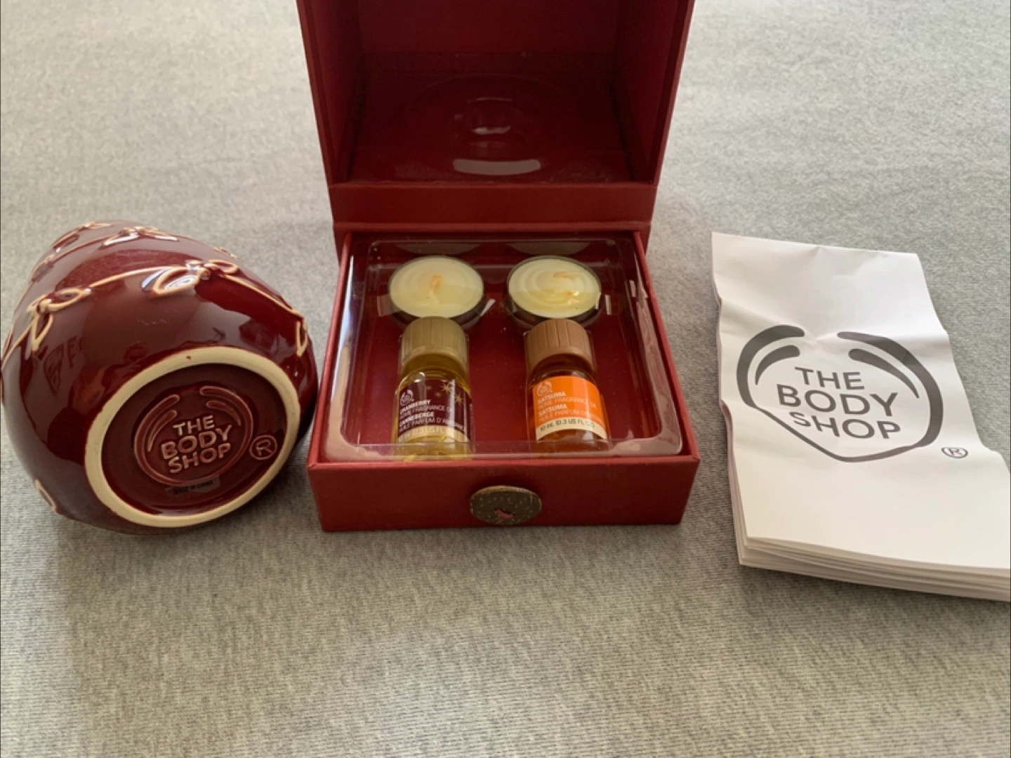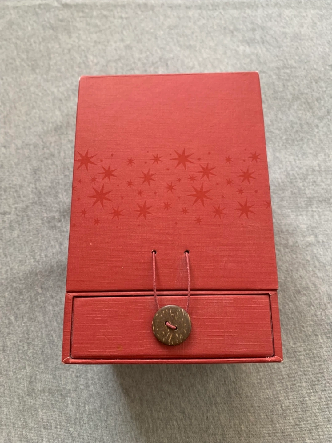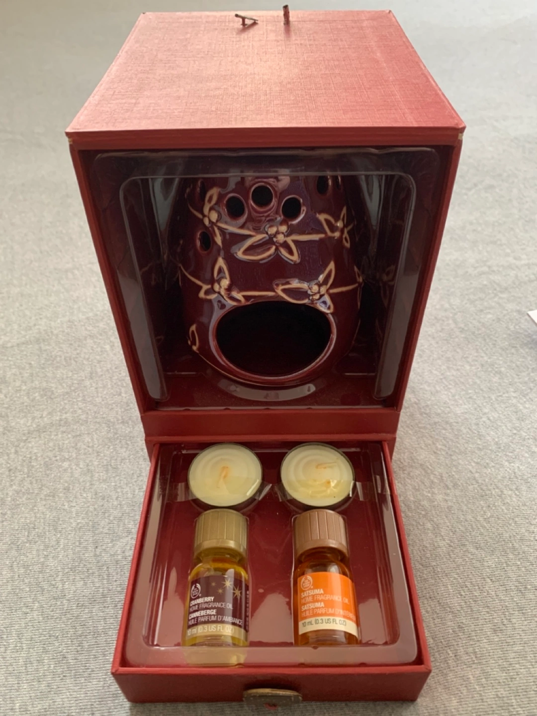 Complete with the ceramic burner, two scented oils (Cranberry + Satsuma), and tea light candles. The original box is really different and charming with an elastic clasp and bottom drawer. It’s been around for a bit. So not exactly fresh crisp giftable new but never been used.