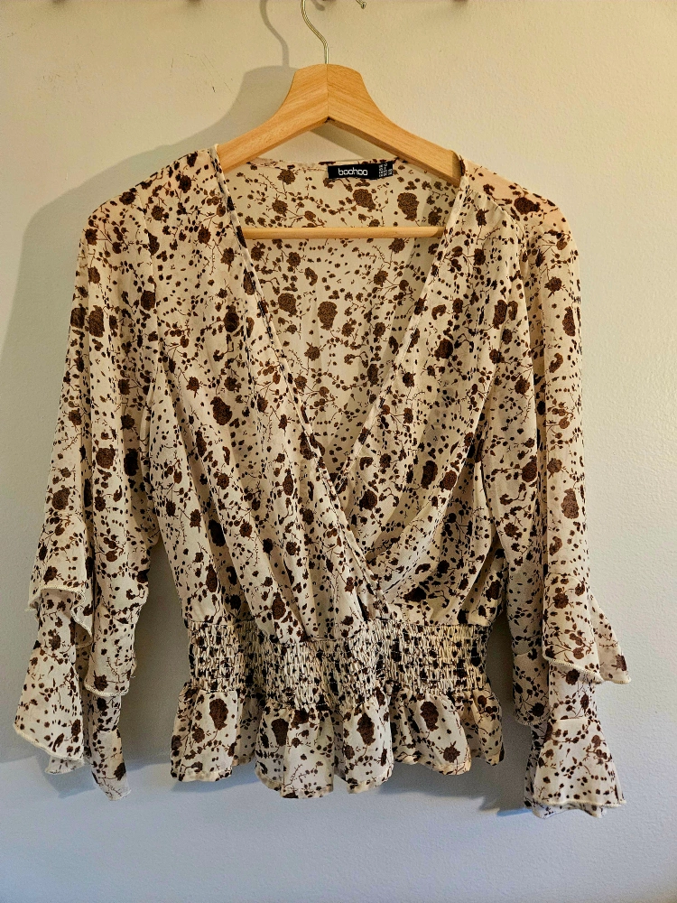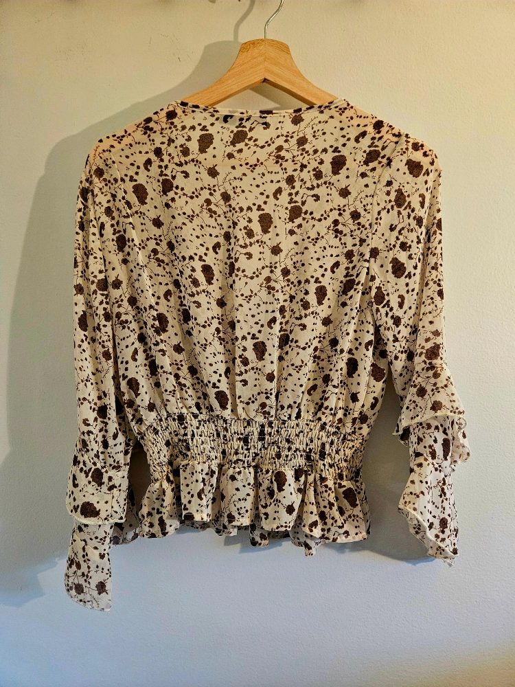 This is a cute floral print blouse. It's a size US 8 and features a flattering wrap-style front. The material is lightweight and perfect for warmer weather. The sleeves have a nice ruffle detail, adding a touch of elegance to the design
