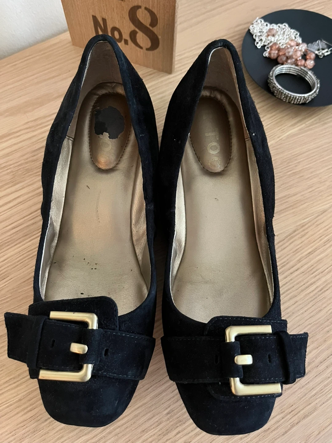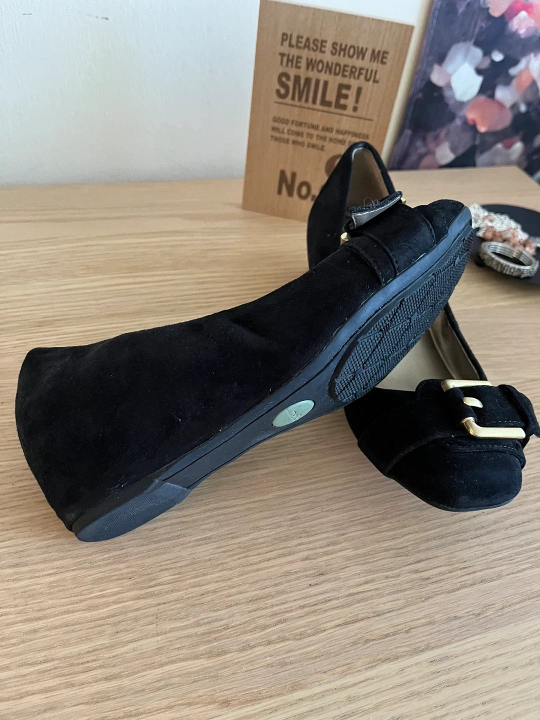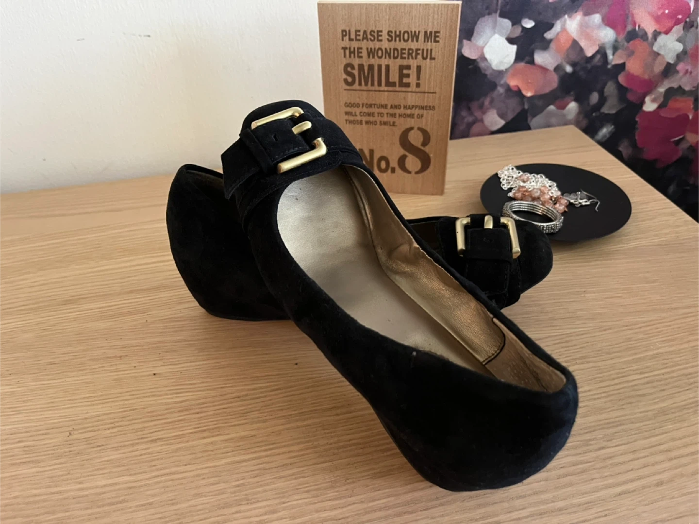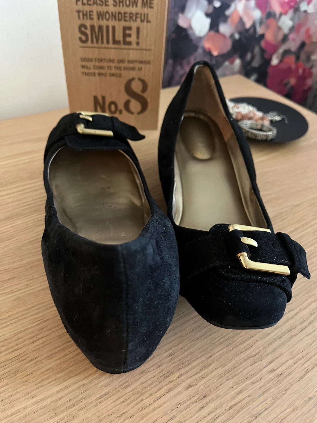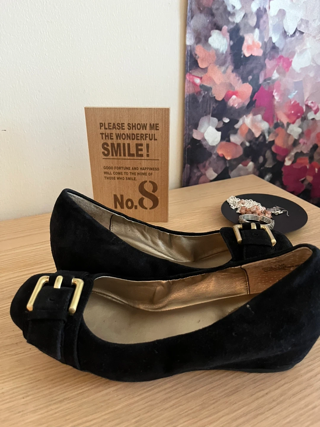 Cute black suede wedges from ME TOO! These are a classic style and would look great with so many outfits. They have a gold buckle detail. I only wore them a couple of times. I damaged a bit of the inside leather of the right shoe right before taking the picture while removing the size sticker 😞