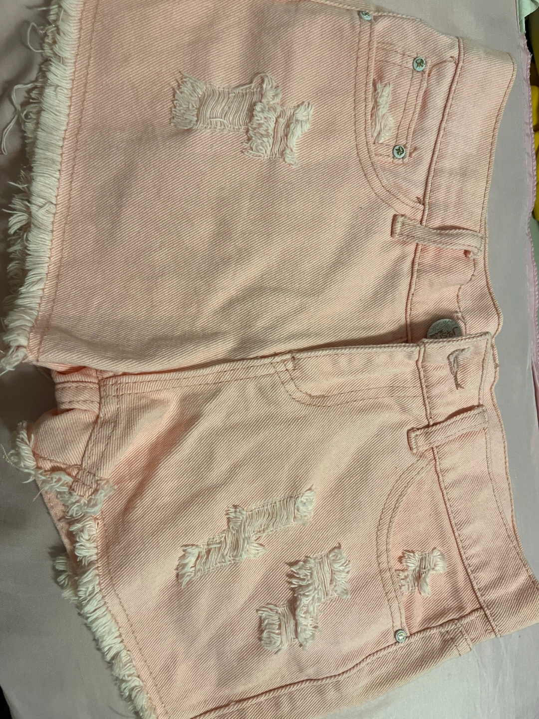 These are a pair of cute pink denim shorts with a distressed look! They are perfect for a casual, summery vibe. The shorts feature frayed edges and distressed detailing on the pockets. They're in great condition and ready for a new home