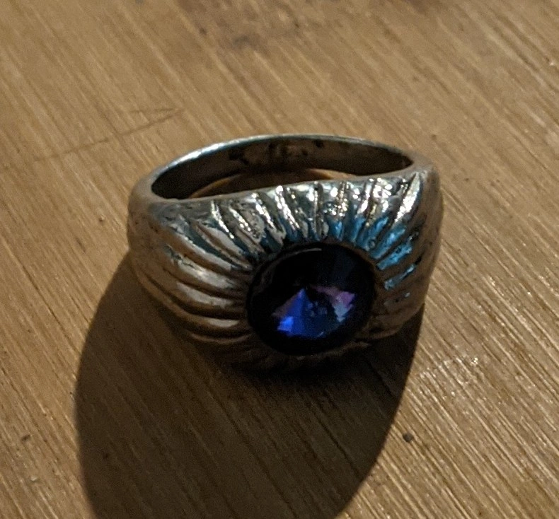 Selling a unique ring featuring a striking blue stone. The ring has a textured design around the stone setting, giving it a distinctive look. It's in good condition and ready to add a touch of elegance to your style