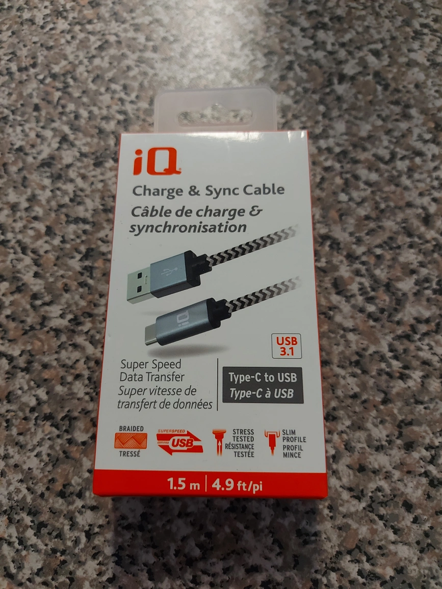 Selling unopened a brand new iQ Charge & Sync Cable! It's a Type-C to USB cable with super speed data transfer. The cable is braided and 1.5m (4.9 ft) long. Slim profile design and stress tested!