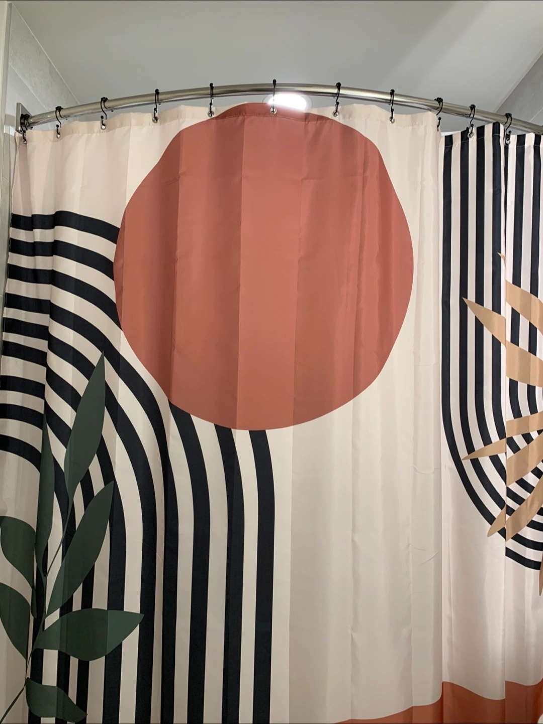 ^*MOVING SALE! ^**Must Go ASAP - Pick-up in Downtown Calgary ONLY! Almost brand new (less than 2 months) shower curtain with a modern, geometric pattern! It features a mix of stripes, a solid circle, and a sunburst design in neutral tones like black, beige, and terracotta. This curtain would add a stylish touch to any bathroom.