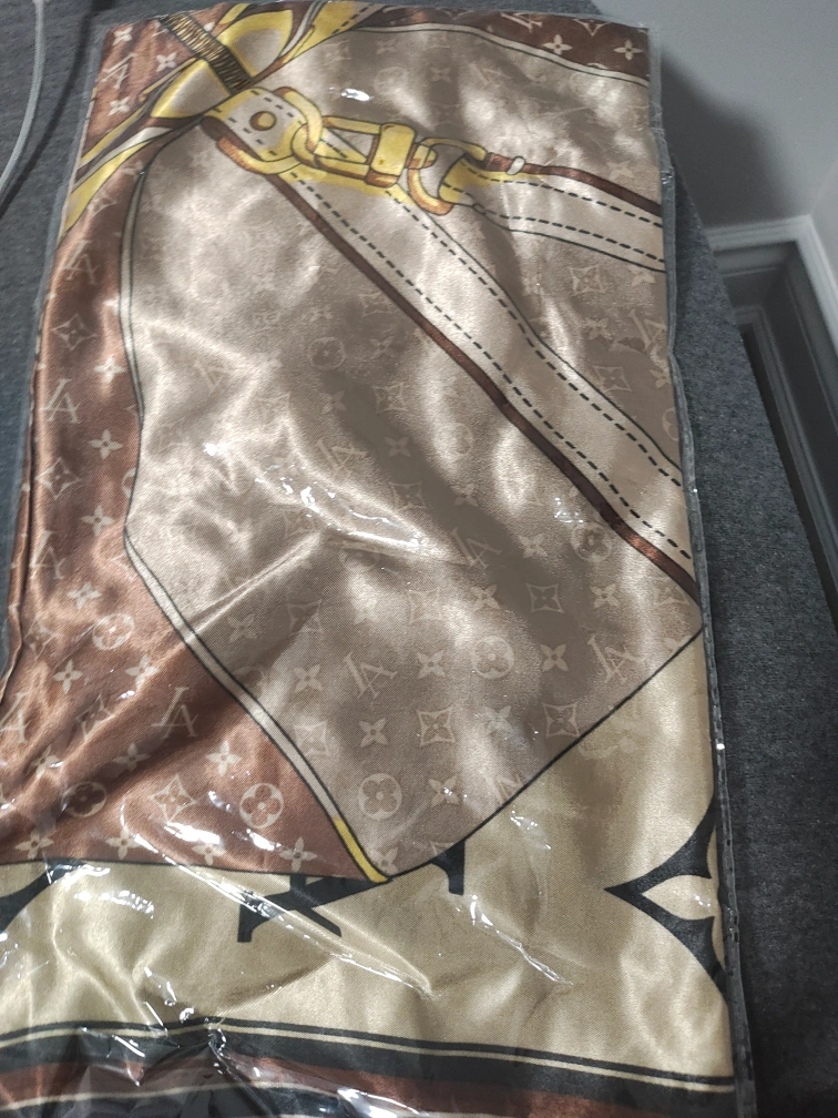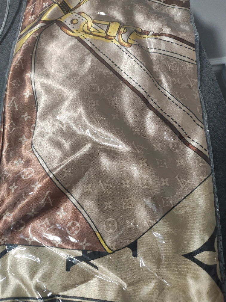 Stylish scarf with a Louis Vuitton inspired design in brown and beige tones. The scarf is in great condition and features a unique pattern with logos and belt details. Perfect for adding a touch of elegance to any outfit!