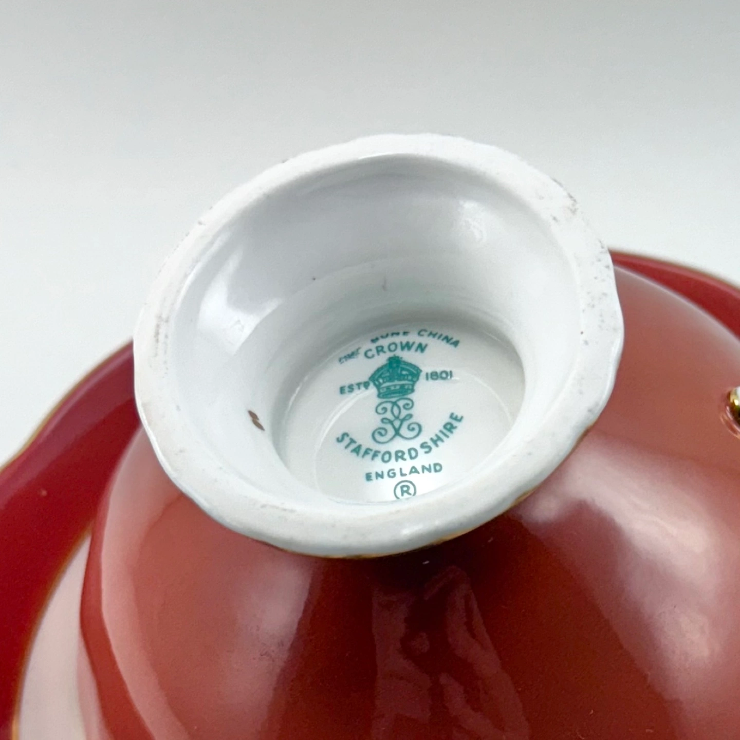 Vintage Crown Staffordshire (made in England) fine bone cu ins extra large breakfast teacup in dark rust orange colour. Teacup is larger than standard size. No chips, cracks, crazing, gold loss or enamel flecks — high ping on both pieces when tapped Meetup Options: 1. Avenue Rd & St Clair Ave (public lobby or driveway of condo) or 2. Outside St Clair/Yonge subway station Sorry, no deliveries, other meetup spots or holds (will only hold during travel time for a confirmed pickup)