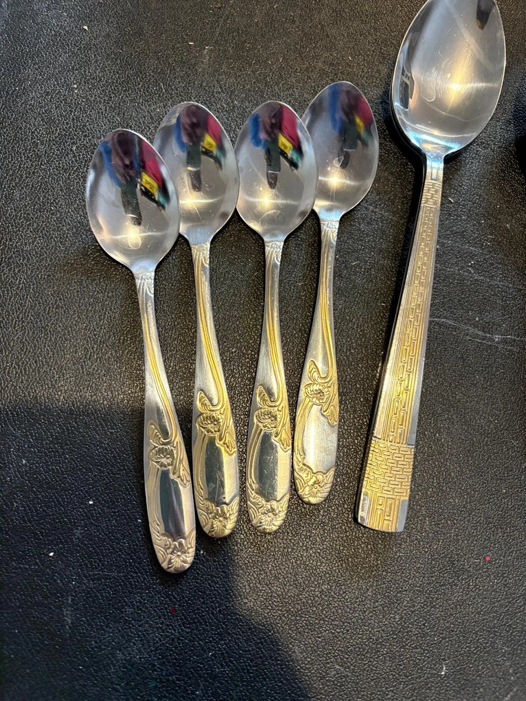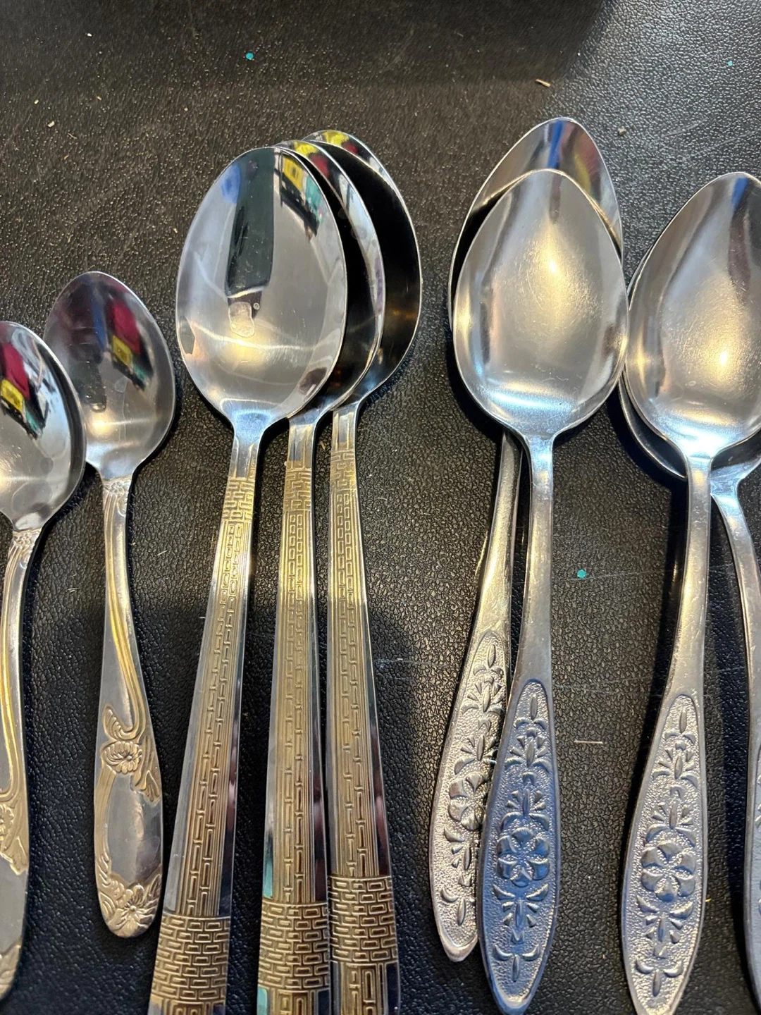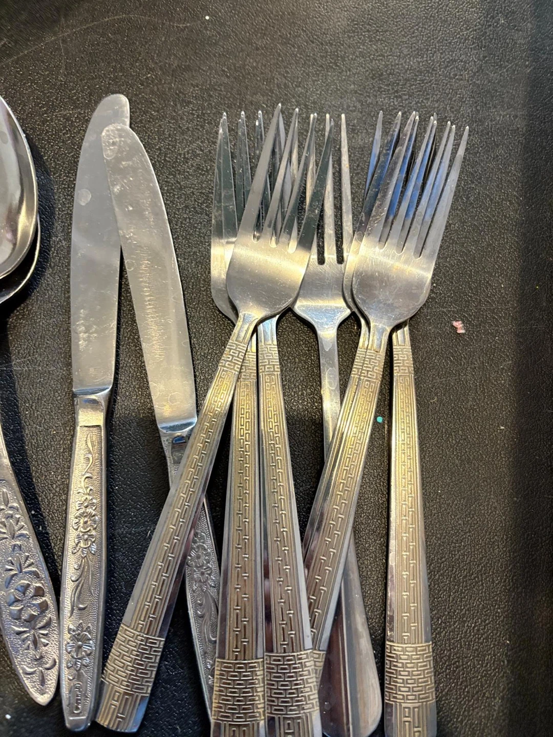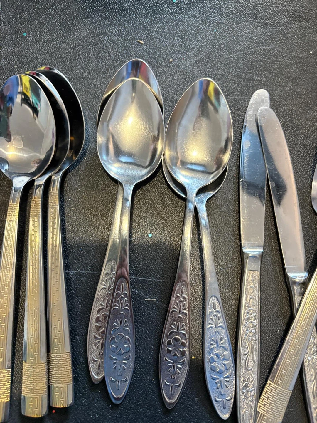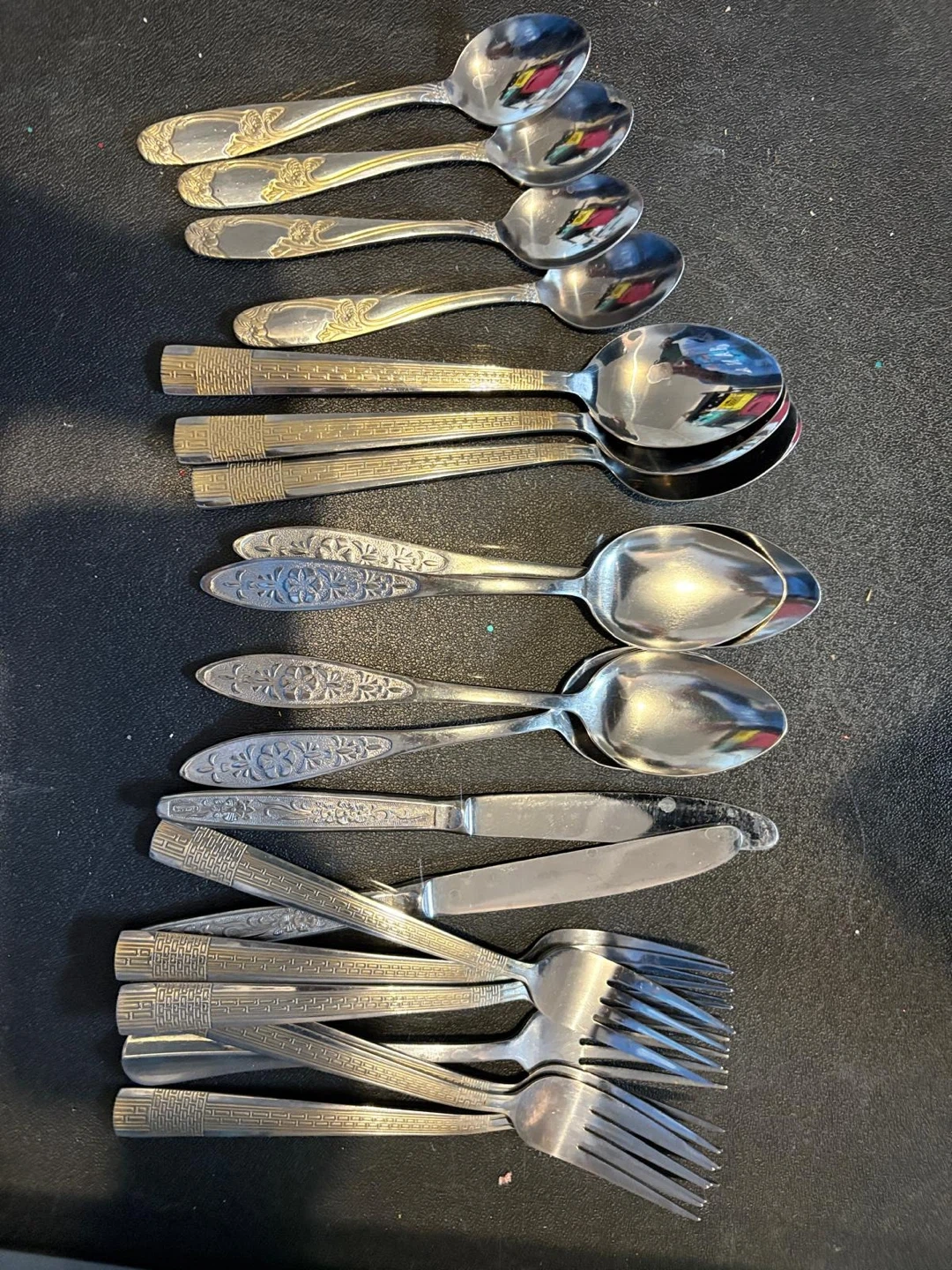 Selling a set of vintage stainless steel flatware. The set includes spoons, forks, and knives, each with unique handle designs. Perfect for adding a touch of retro charm to your dining table!