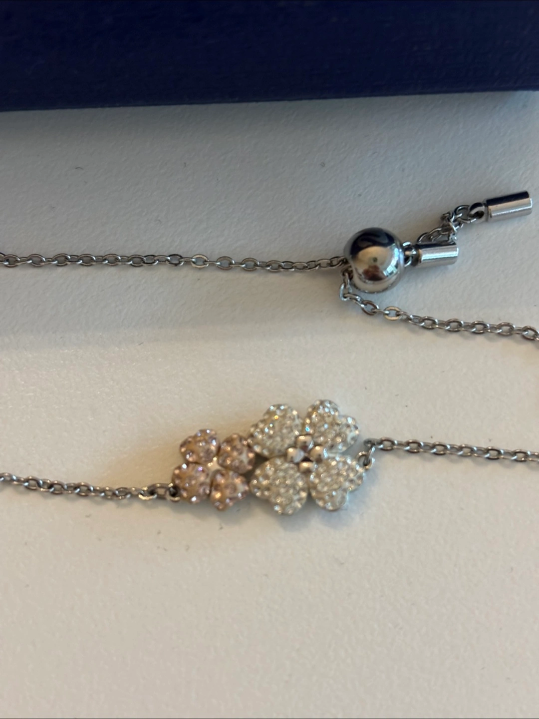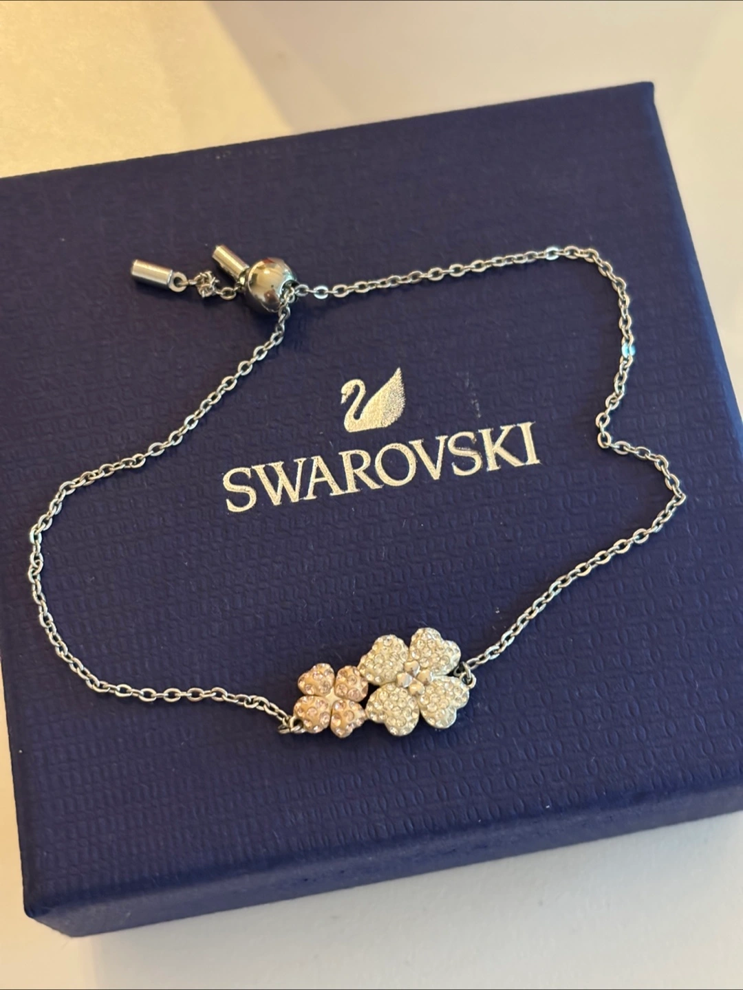Selling a beautiful Swarovski clover bracelet! It's in great condition and comes with its original box. The bracelet features delicate clover designs adorned with sparkling crystals, adding a touch of elegance to any outfit. Perfect for adding a bit of sparkle to your day!
