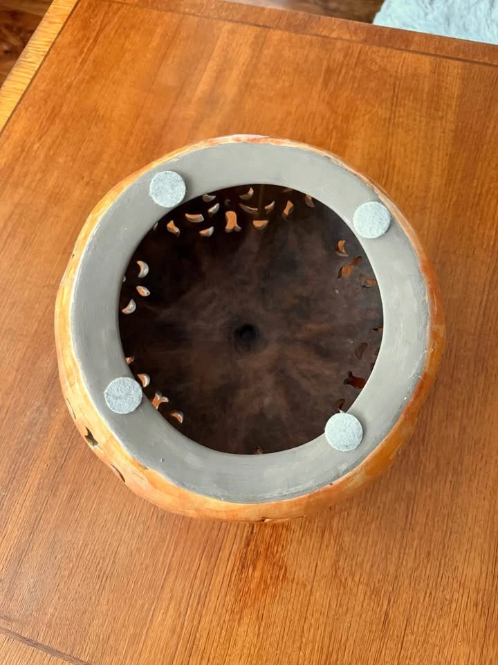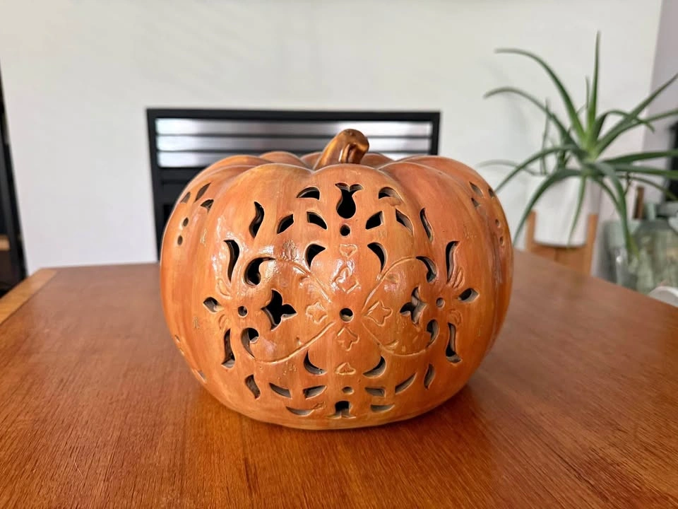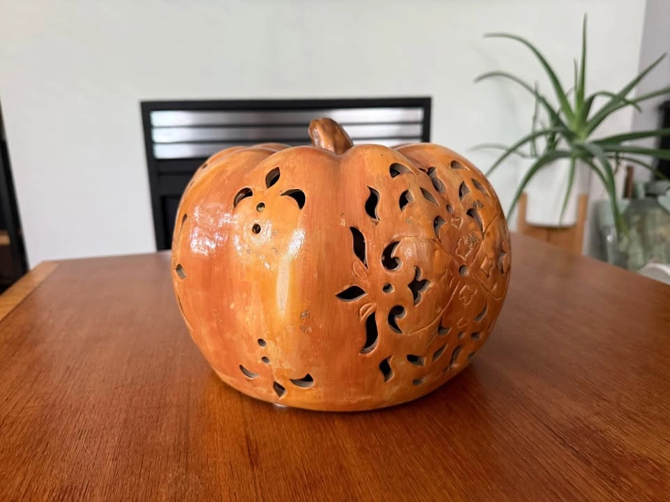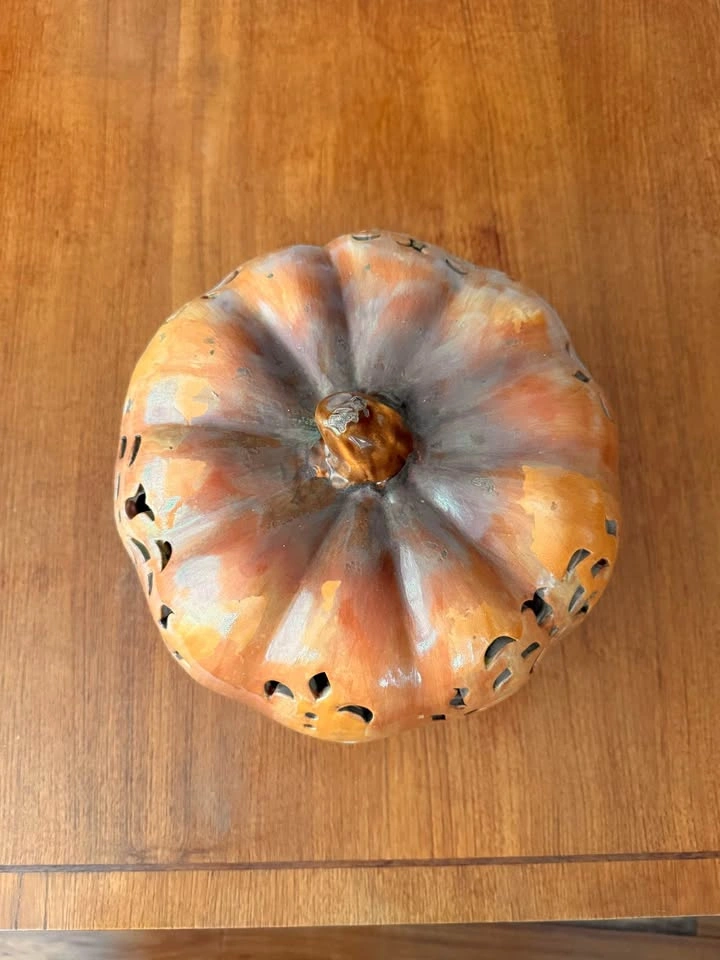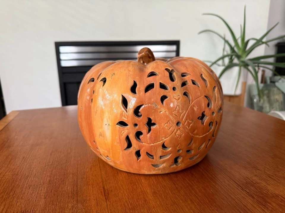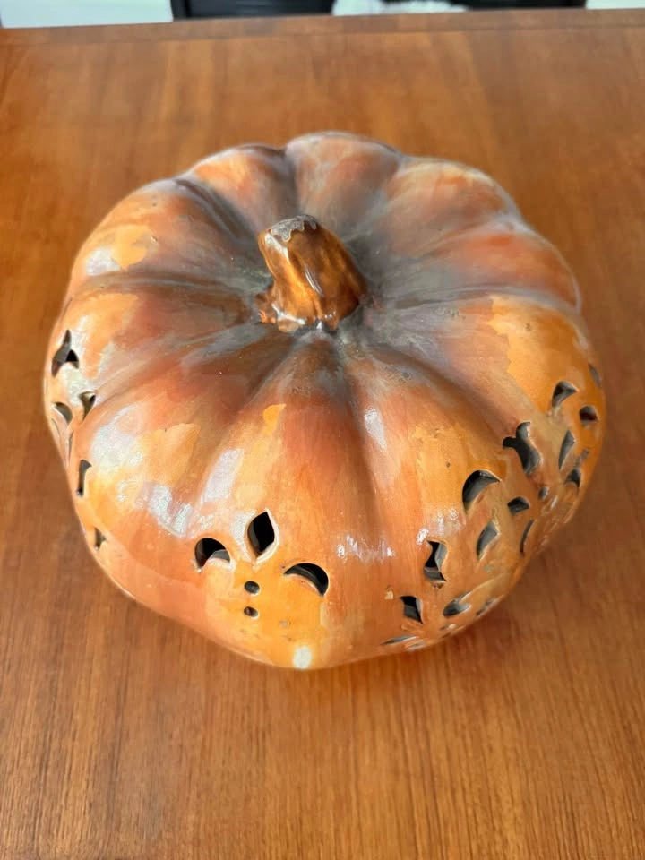Porcelain pumpkin originally bought from Pottery Barn. In good condition. The outer glaze/coating is flaking in some areas (visible in photos) Width 10 inches Height 7.5 inches