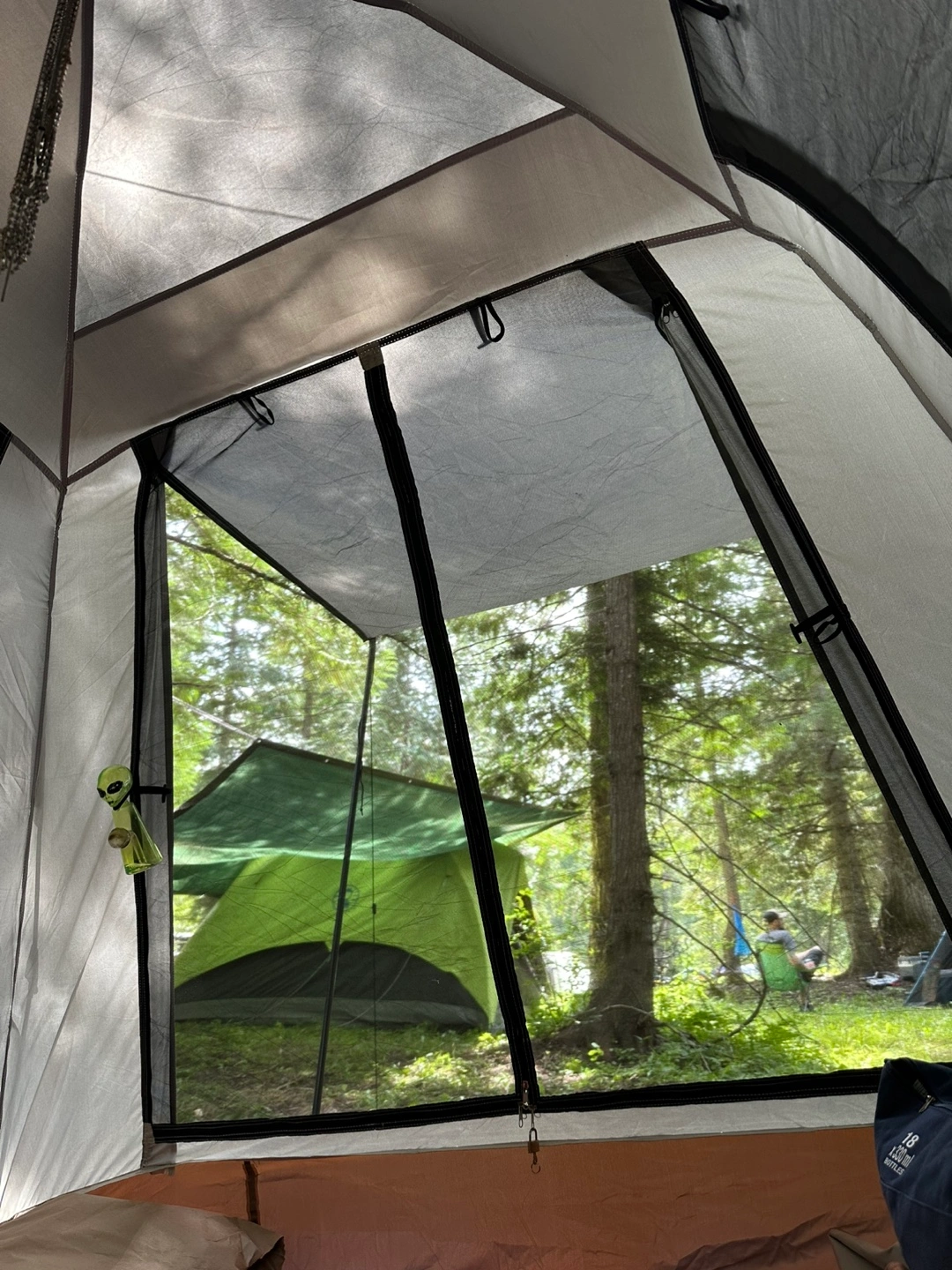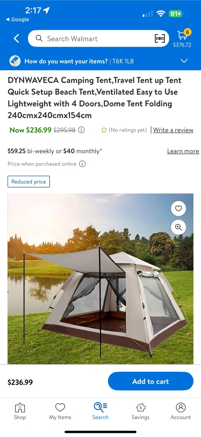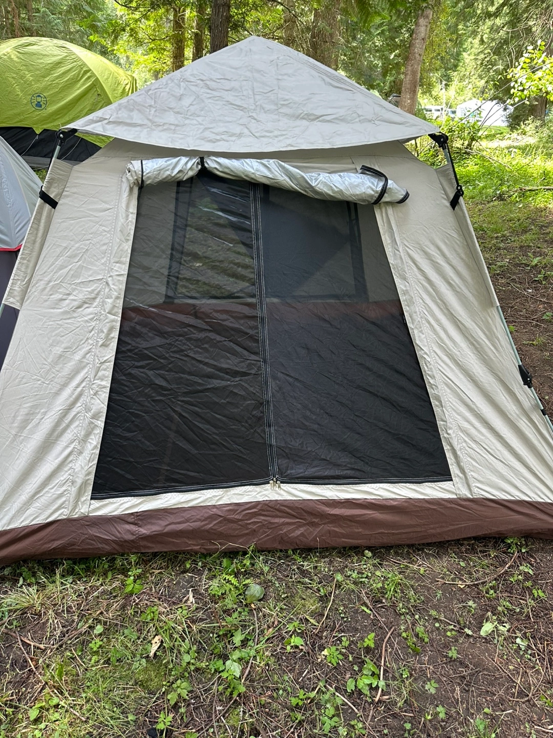 Selling a camping tent with a fiberglass pole. It's a beach tent that's easy to set up and lightweight. It has 4 doors and is ventilated. The size is 240cm x 240cm x 154cm. Regular price $236.99.