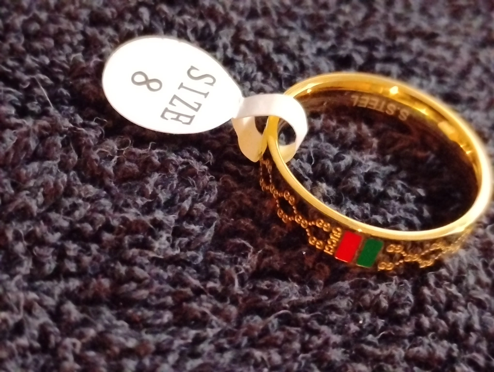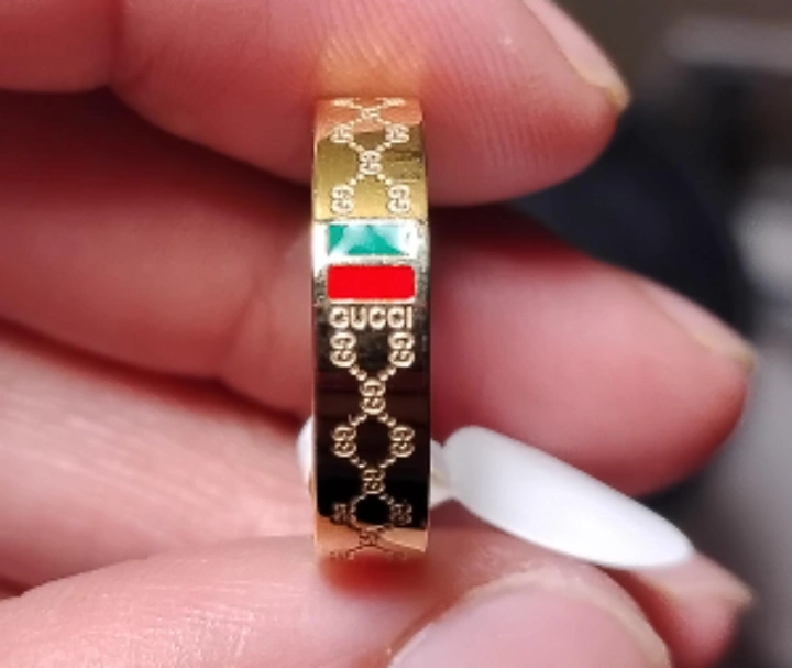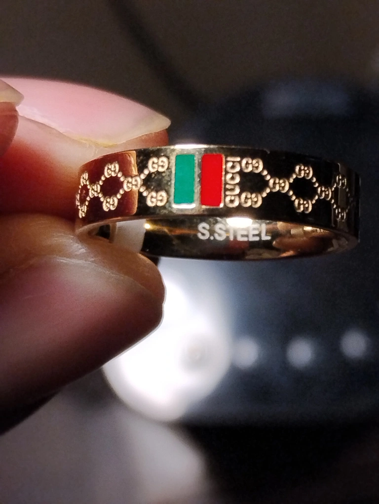 Selling a Brand New Gucci ring in Gold with the iconic GG logo and green and red enamel detail. The ring is made of S.Steel. Never been Warren!
