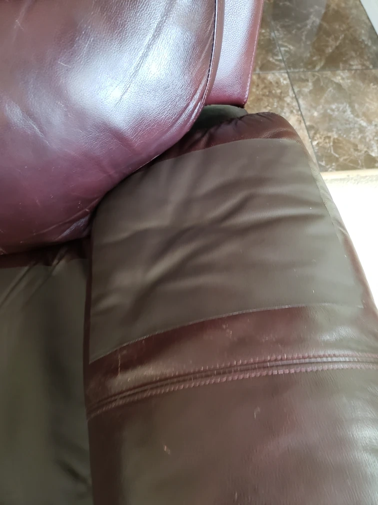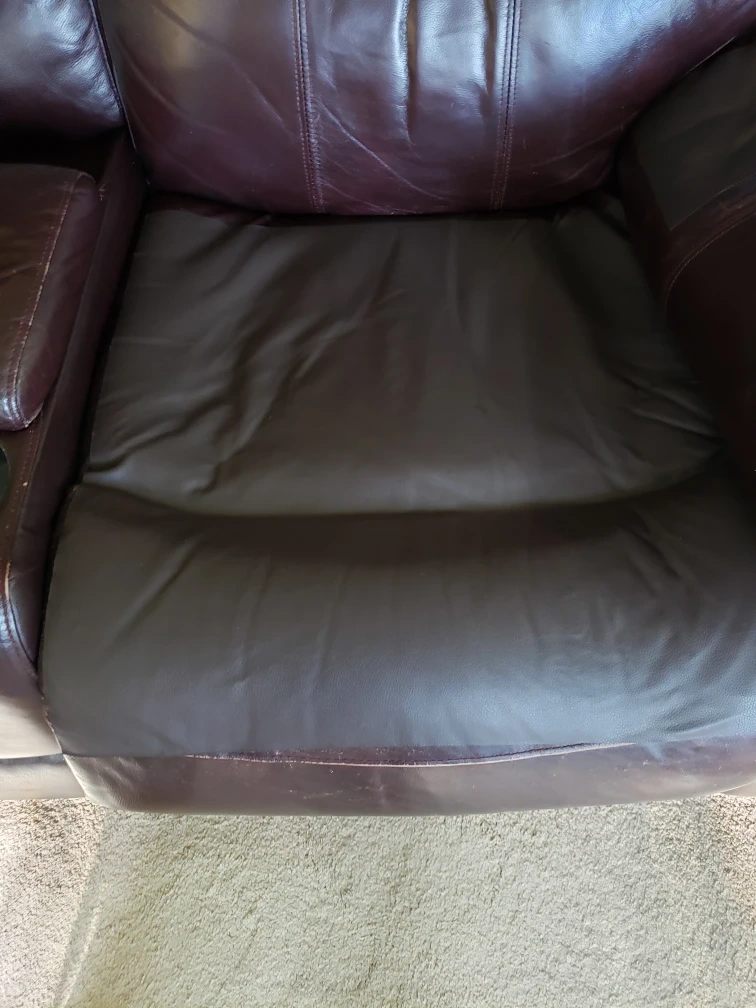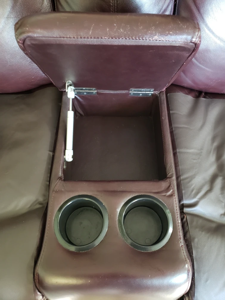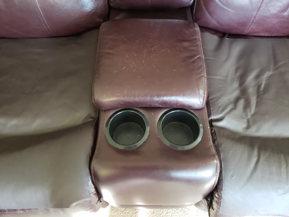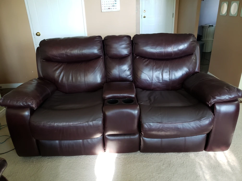 MOVING SALE.......Looking to sell ASAP $200 OR Best Offer......... From a Vegetarian, Smoke free, Pet free house Selling a comfy leather power reclining loveseat! It features a centre console with cupholders and storage. It's perfect for relaxing and watching movies with a friend or loved one. There are some leather patches to cover the signs of wear, but it's still in great condition for relaxing!