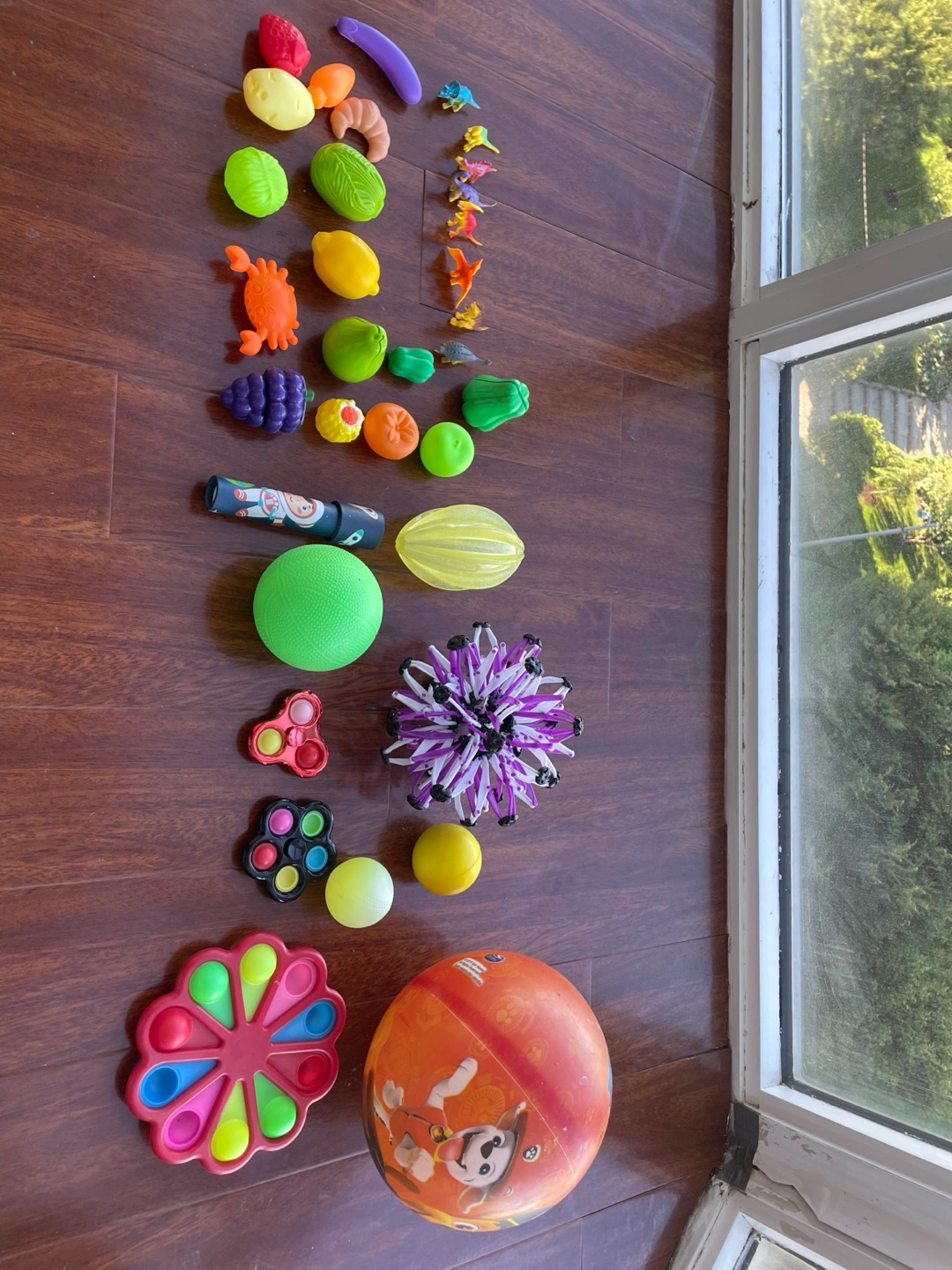 A collection of fun toys for kids! There are various colourful toys, including some fruits, animals, balls, and fidget toys. Perfect for keeping little ones entertained