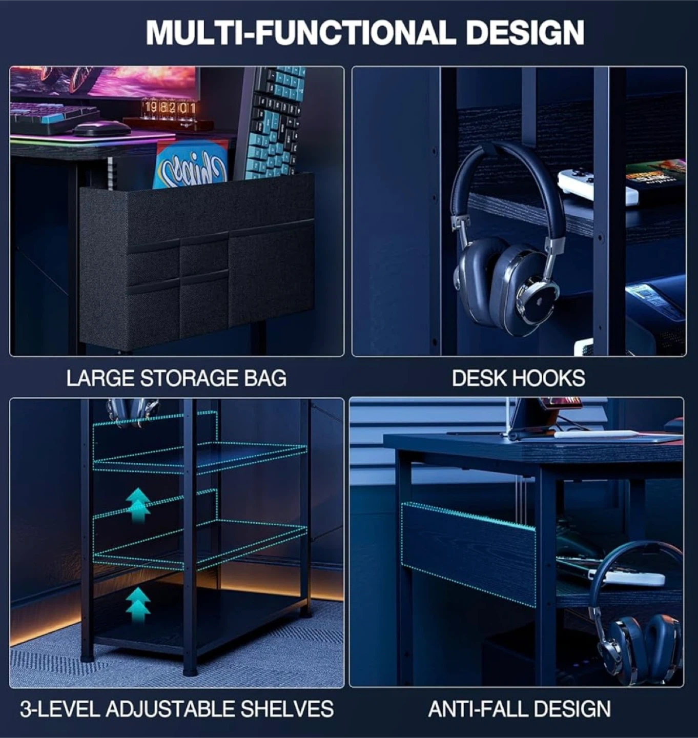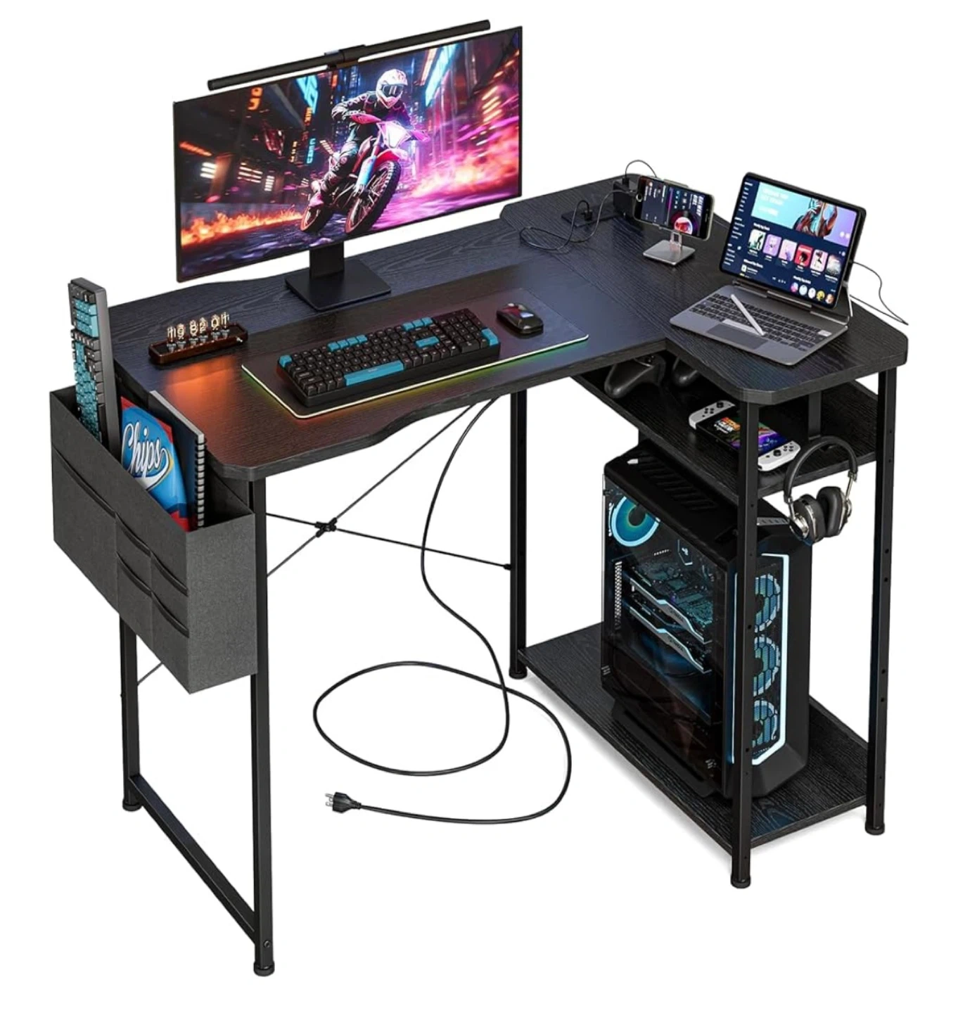 Looking to level up your gaming setup? This black L-shaped gaming desk is perfect for creating an immersive experience! The desk features a spacious surface for your monitor, keyboard, and other accessories. It also includes a convenient side storage bag and a shelf for your PC tower or gaming consoles. Dimensions: - 27.5" x 40" (top surface) - 28.7" height - Max load: 176lbs