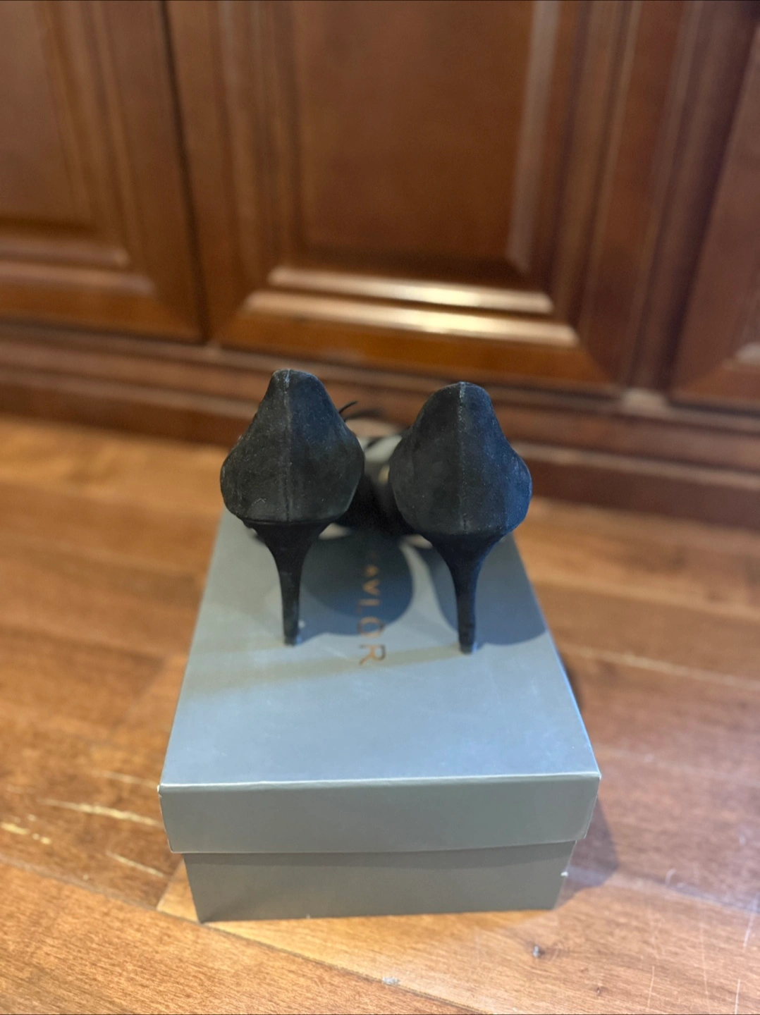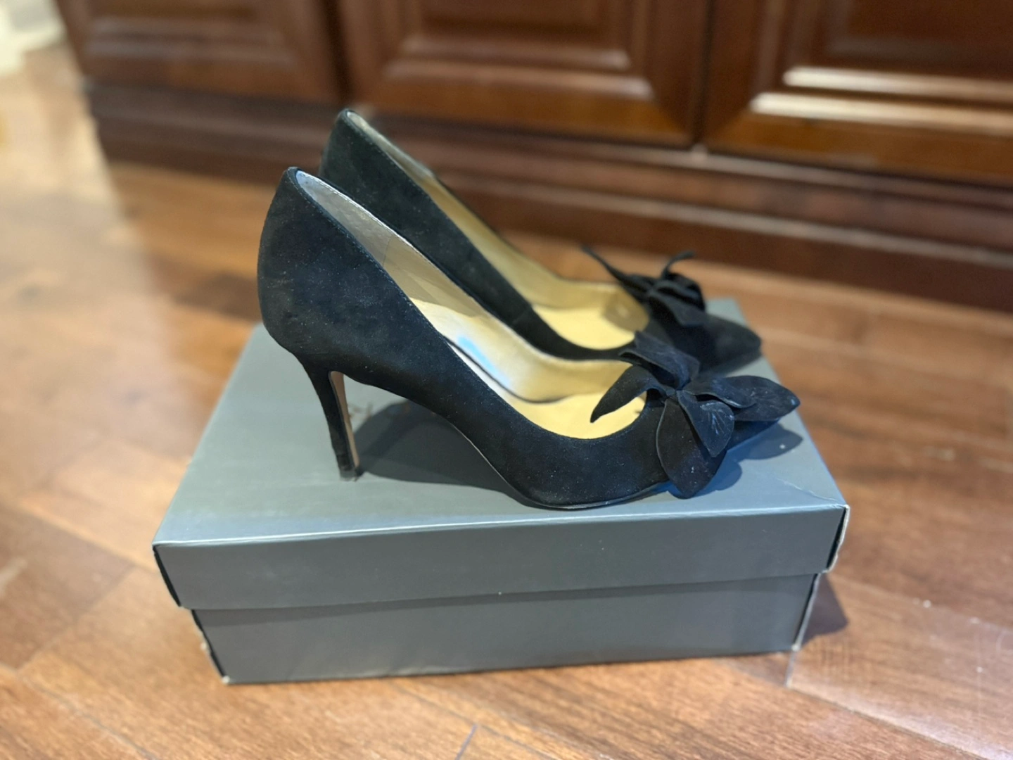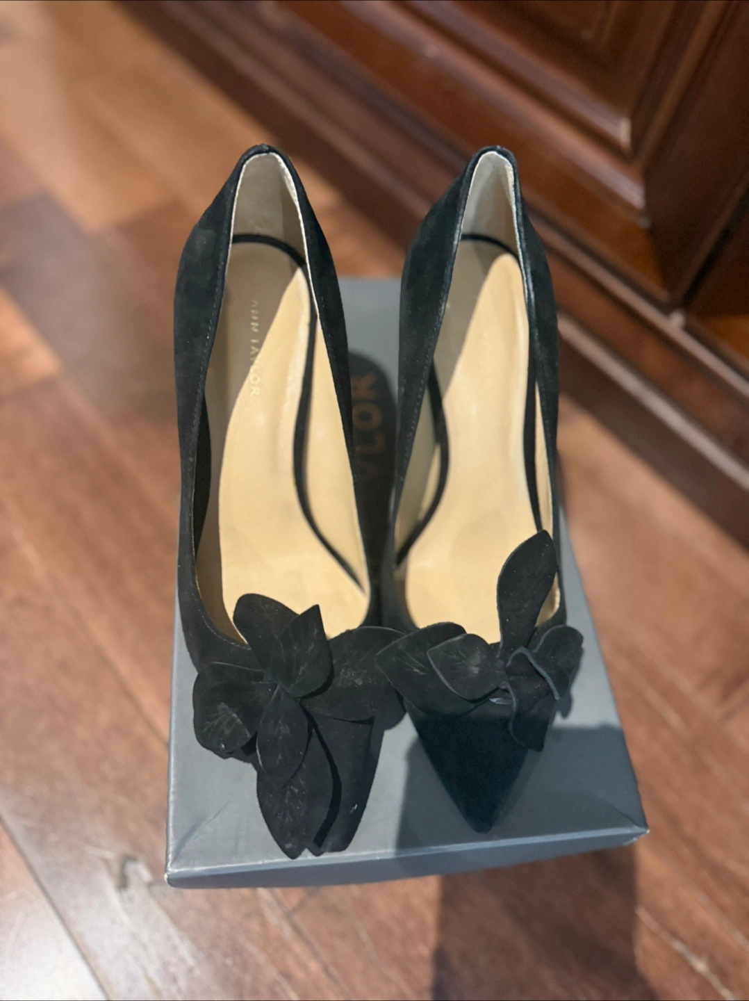 These are a pair of Ann Taylor black suede flower pumps in a size 6. They come with their original box. These stylish heels would be a great addition to your wardrobe!