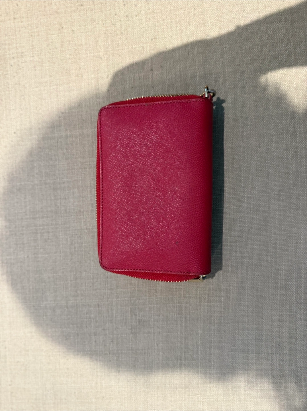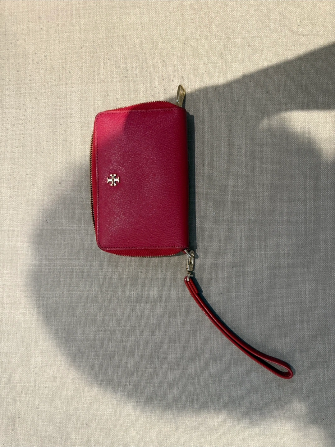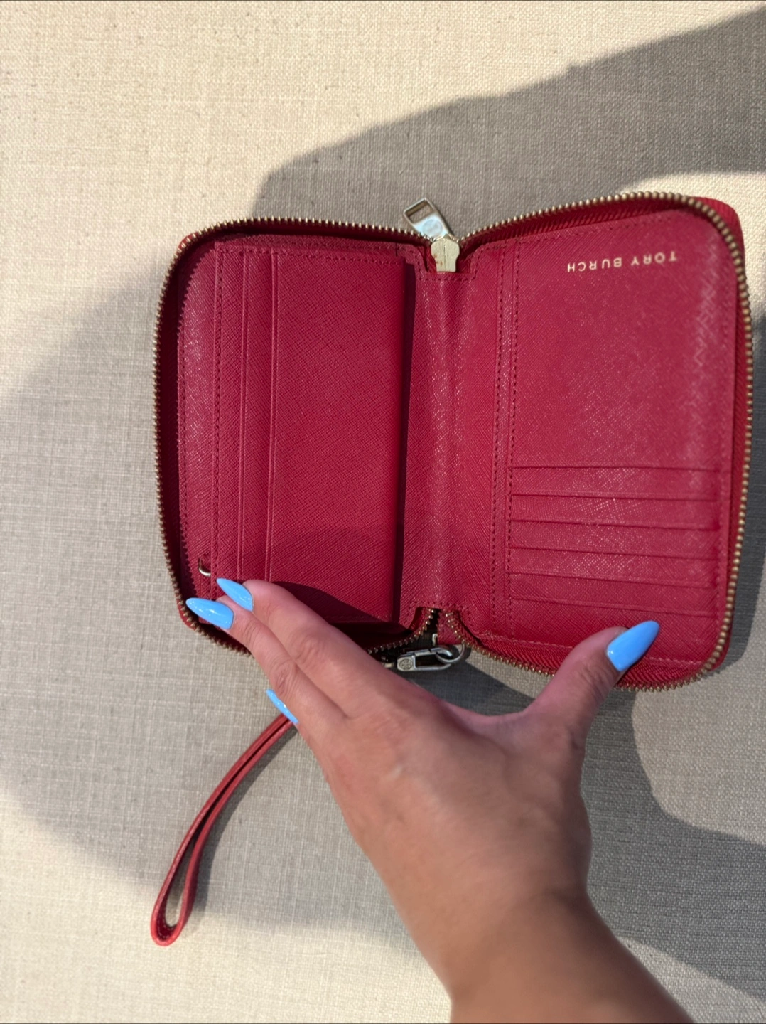 Selling a red leather wallet from Tory Burch. It's in great condition and perfect for everyday use! It has a convenient wrist strap, making it easy to carry around. The wallet features the Tory Burch logo. Feel free to message if you have any questions