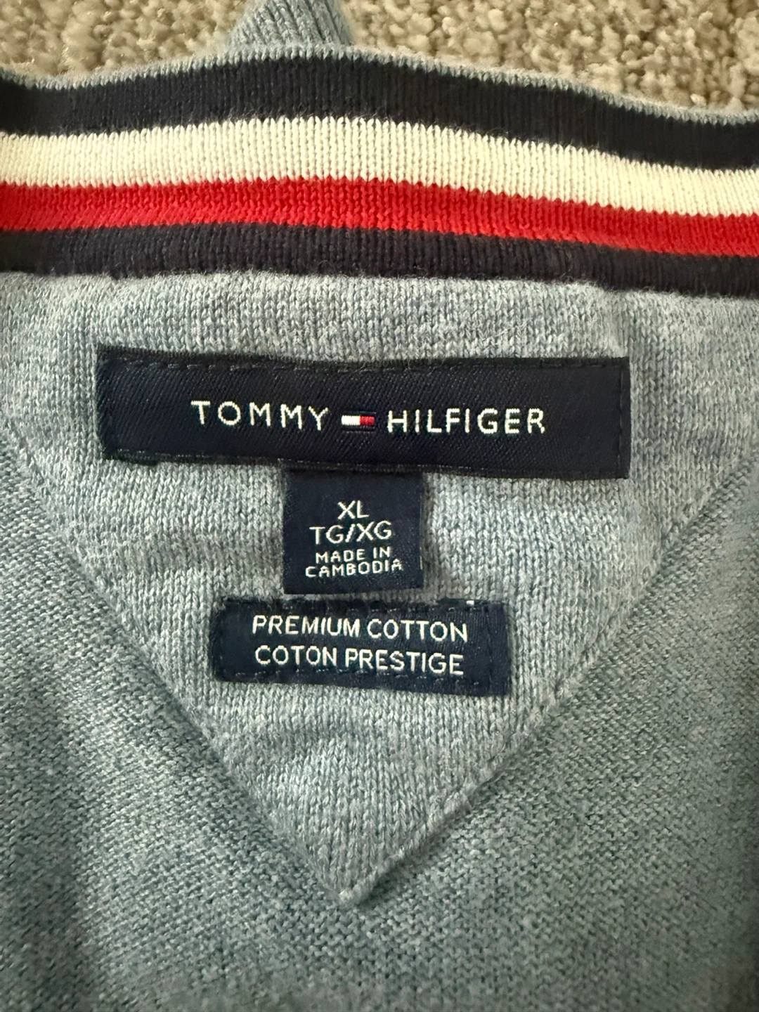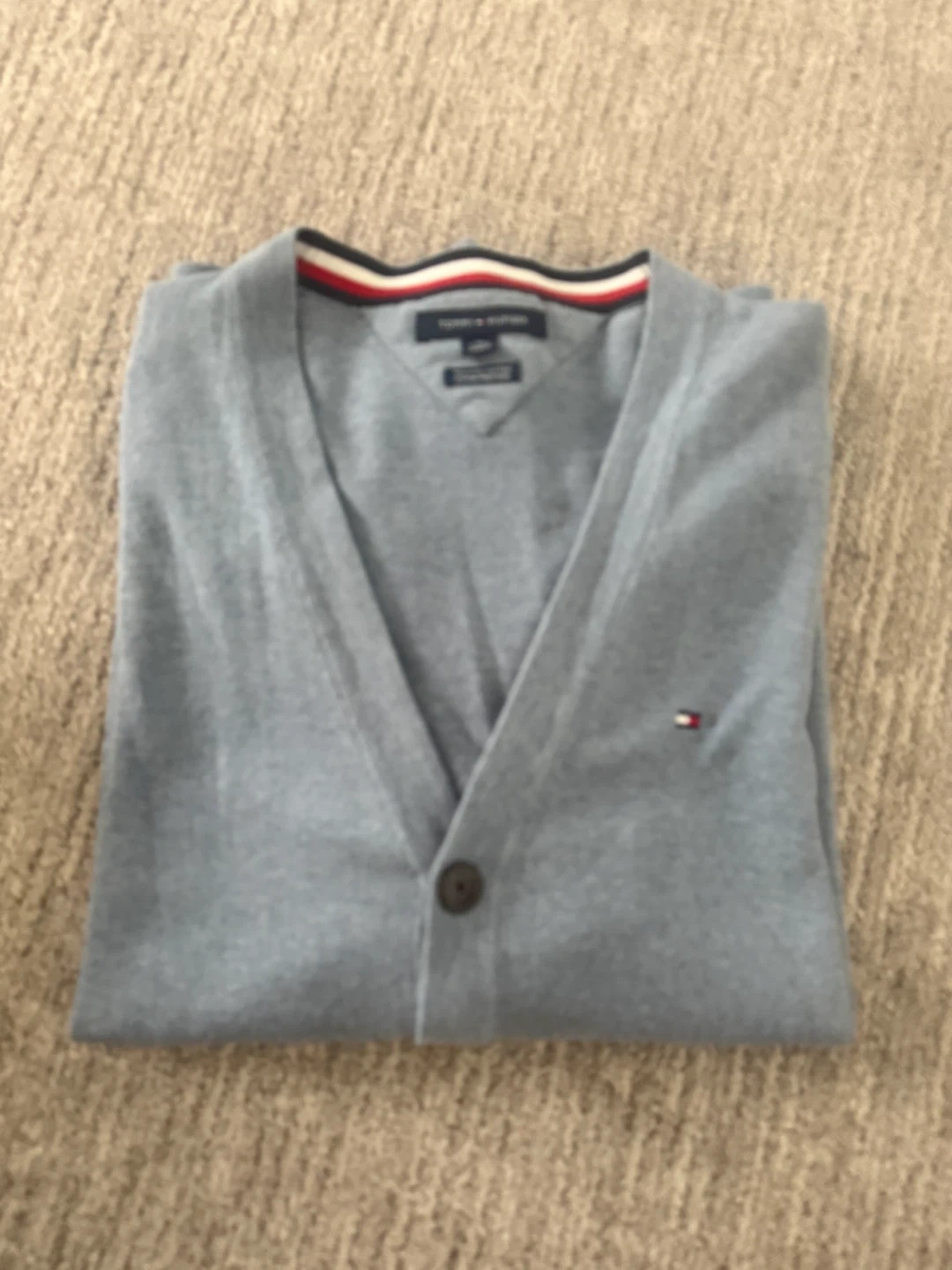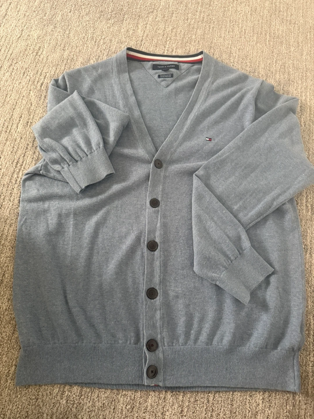 Here's a Tommy Hilfiger cardigan in size XL! It's made from premium cotton and is a lovely light blue colour. Perfect for layering or wearing on its own!