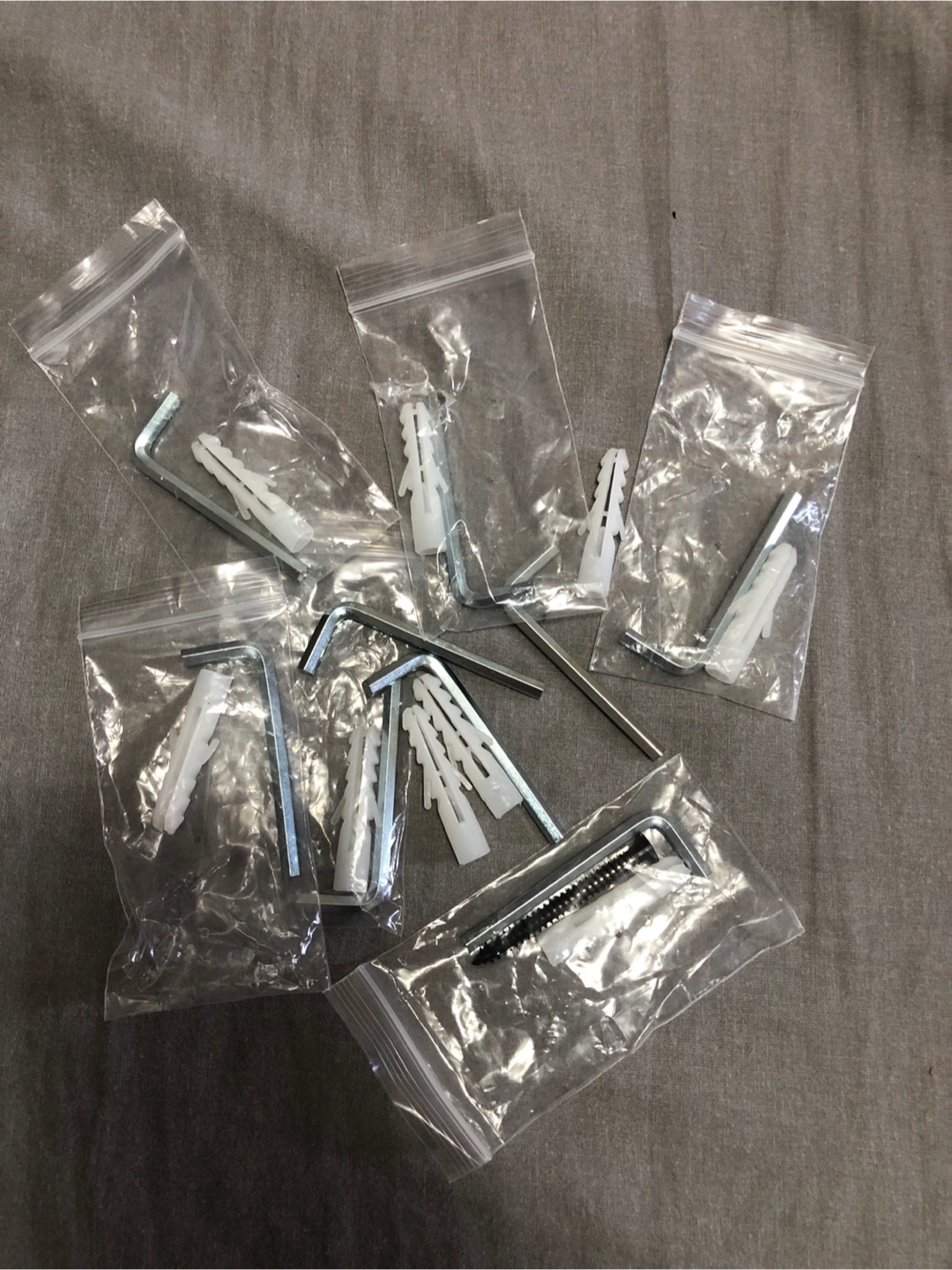 I have a collection of wall anchors and Allen keys. They are in individual plastic bags.