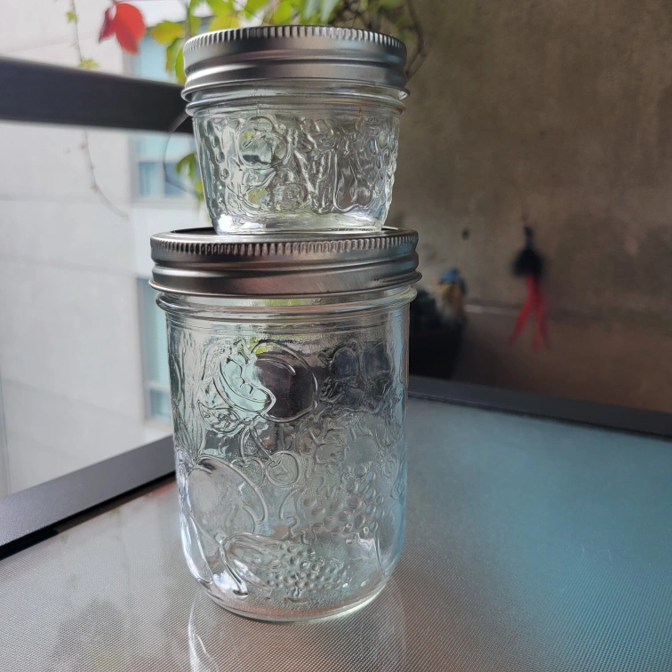 Selling two mason jars, one larger and one smaller. They are clear glass with silver lids and a fruit pattern embossed on the sides. Perfect for canning, storage, or crafts!