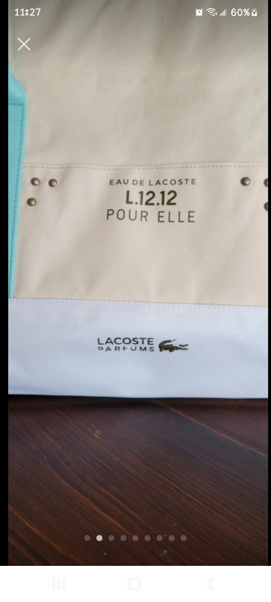 Large Lacoste tote bag. Cream and white canvas. Light teal accents. Zipper closure. Interior pocket. Excellent condition. Never-used, practically new. L = 13" W= 21" Bottom Width= 6" Handle drop= 9" Check out my other listings and bundle to save. ππ»πΈ Cash and pickup only on Brimley and Eglinton Rd E. in Scarborough.