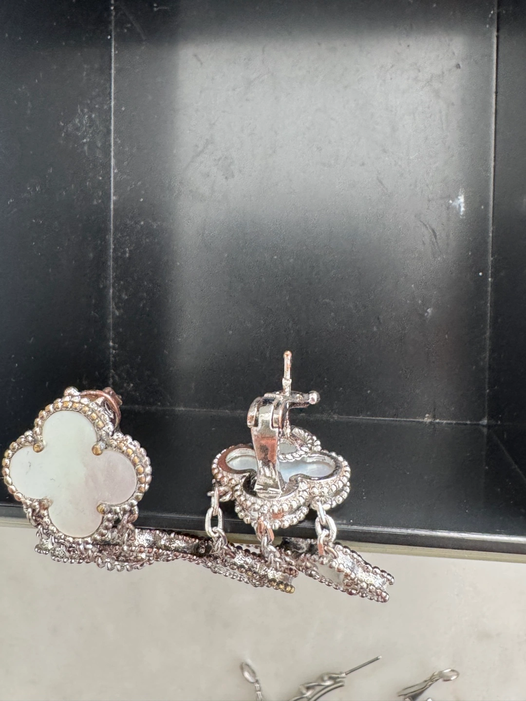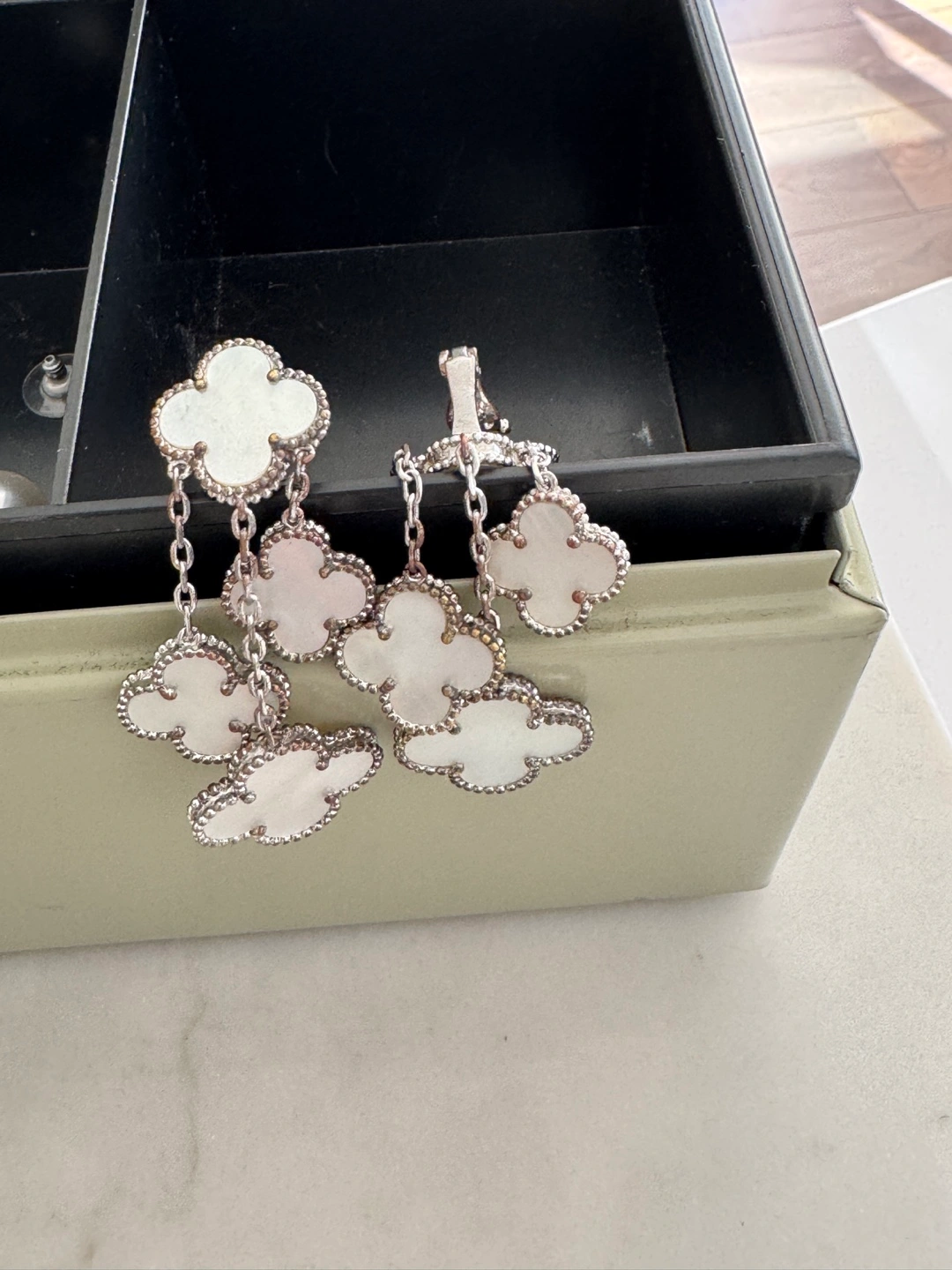Selling a pair of Van Cleef & Arpels earrings featuring the iconic Alhambra clover design in mother of pearl. These earrings are in great condition and would make a wonderful addition to any jewellery collection. They have a beautiful, classic look that can be dressed up or down. Perfect for any occasion!