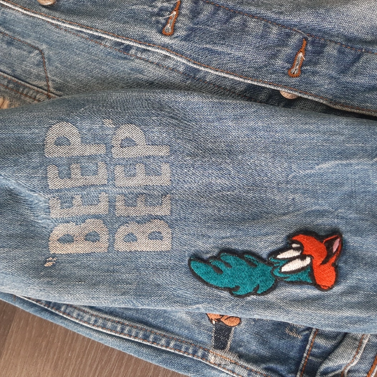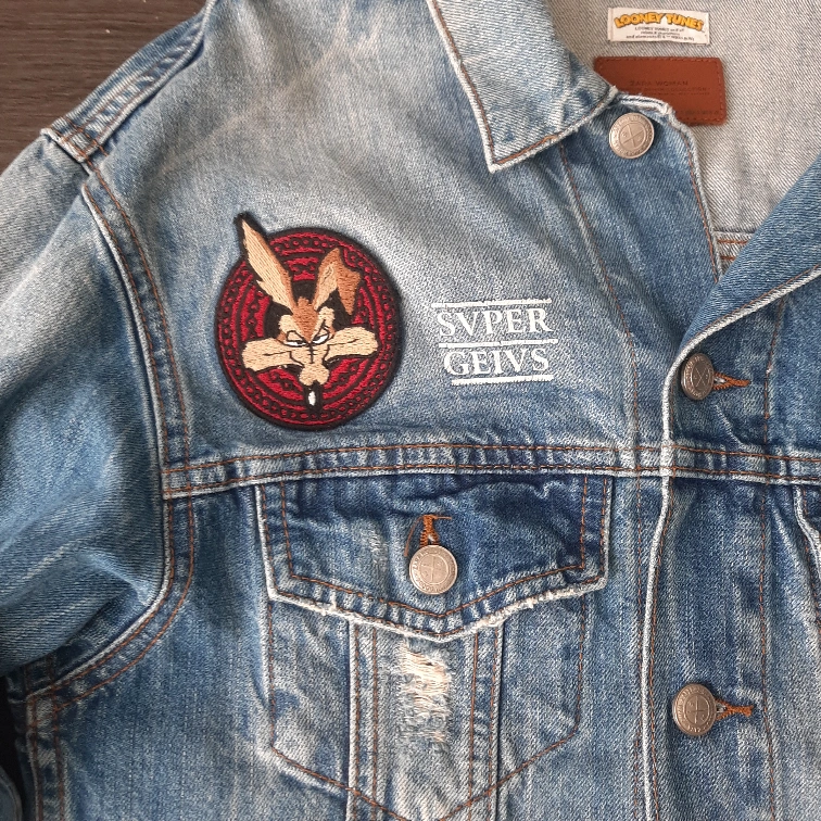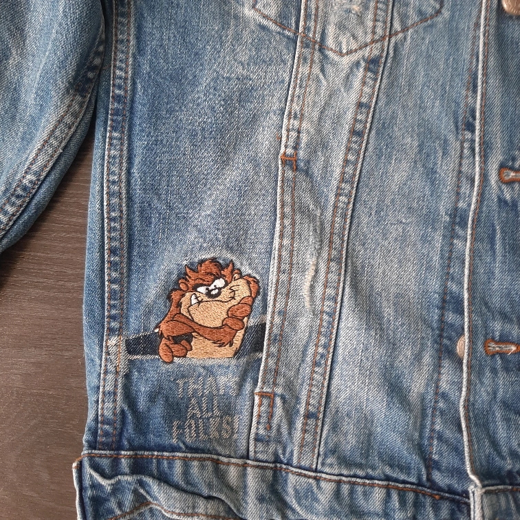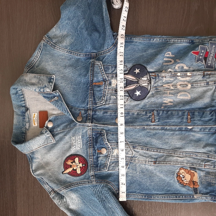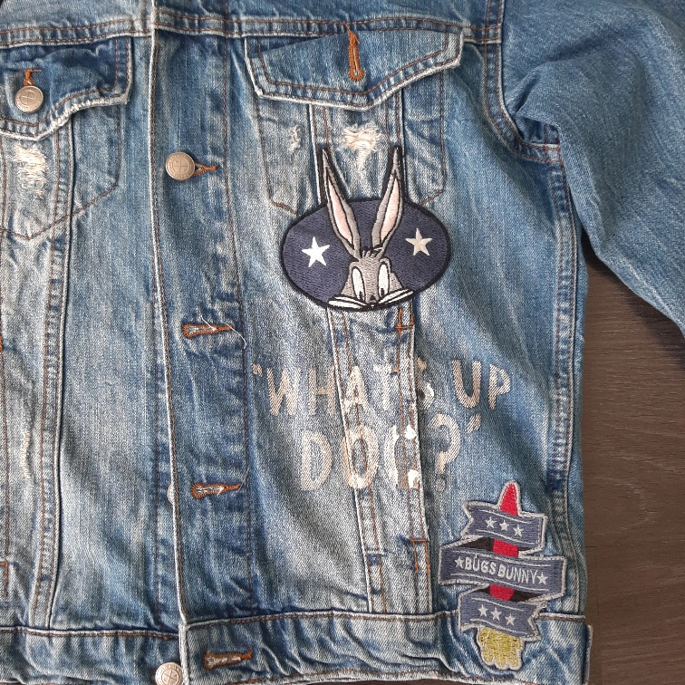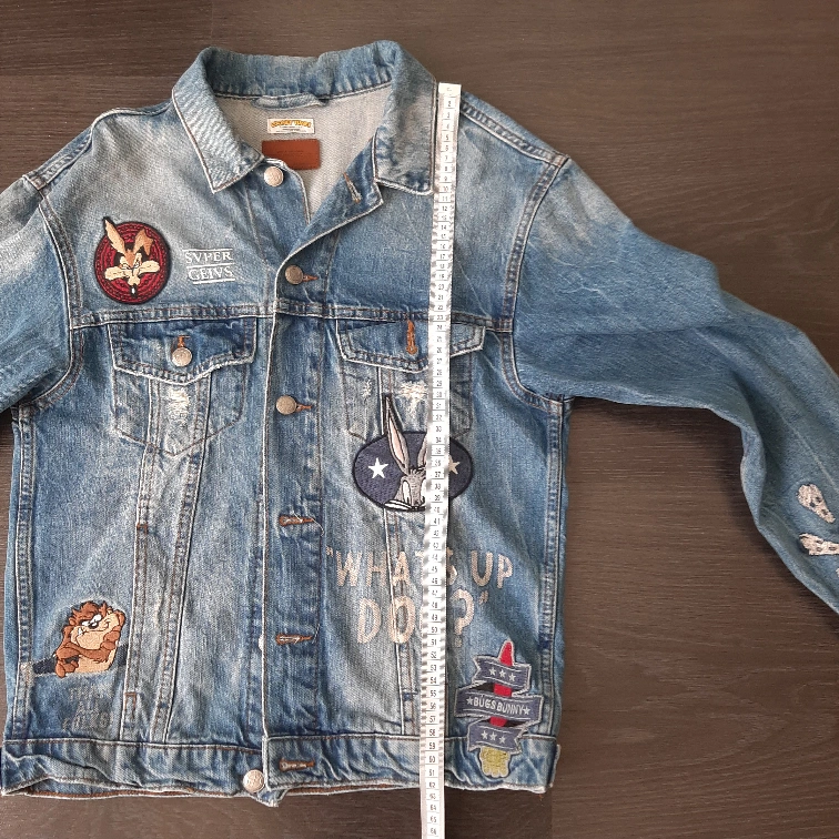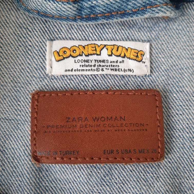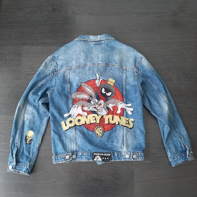 Selling a Zara Woman denim jacket featuring Looney Tunes characters. It's a size small and in great condition. This jacket has a unique design with various patches and prints of classic Looney Tunes characters. The denim has a slightly distressed look, giving it a cool, vintage vibe