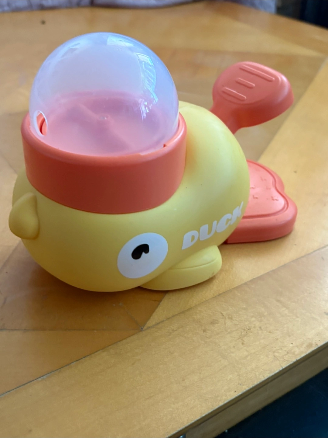 This is a cute yellow duck treat dispenser toy! It's designed to be easy to fill, so you can just pour in pet food and let your furry friend play. The toy encourages your pet to press the handle to release treats, making it a fun and engaging experience for them Only available for pick up.