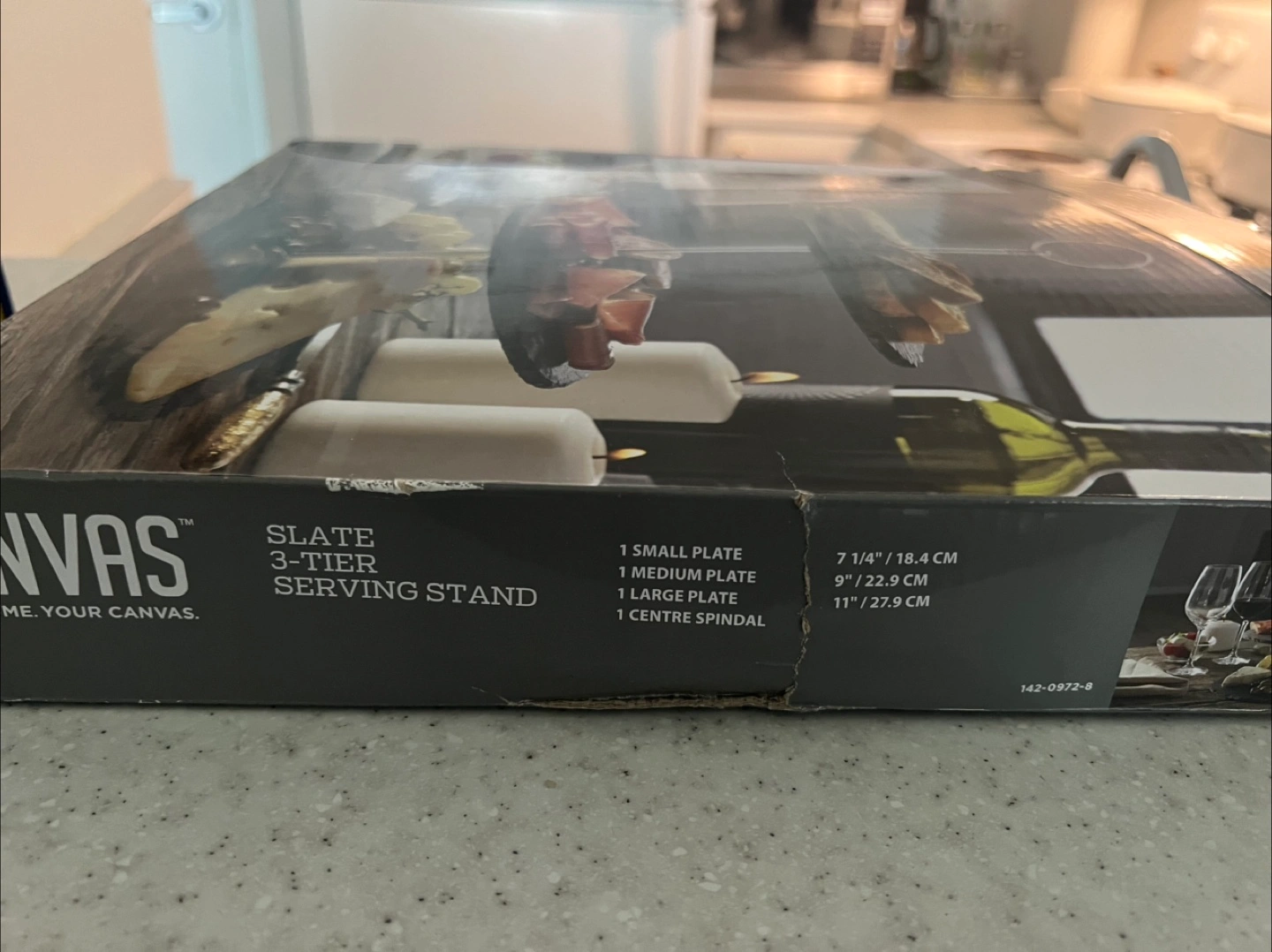 Selling a Canvas Slate 3-Tier Serving Stand. It comes with: - 1 small plate (7 1/4" / 18.4 cm) - 1 medium plate (9" / 22.9 cm) - 1 large plate (11" / 27.9 cm) - 1 centre spindal