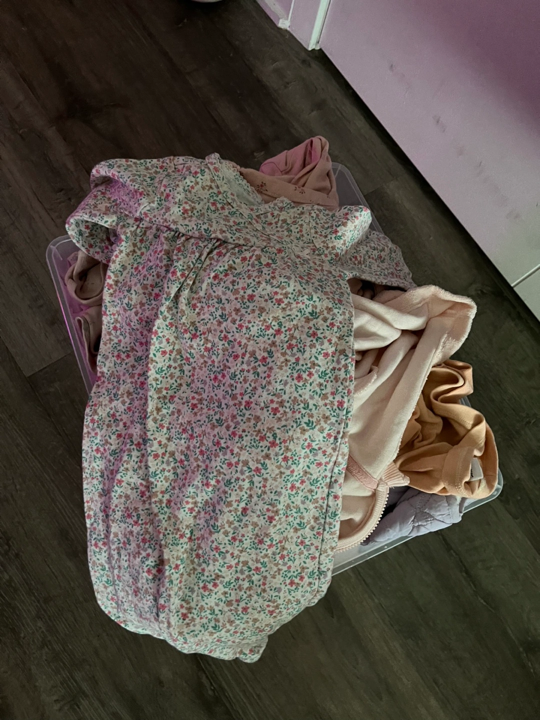A collection of baby clothes, perfect for your little one! The clothes feature a mix of colours and patterns. They are in good condition and ready for a new home!