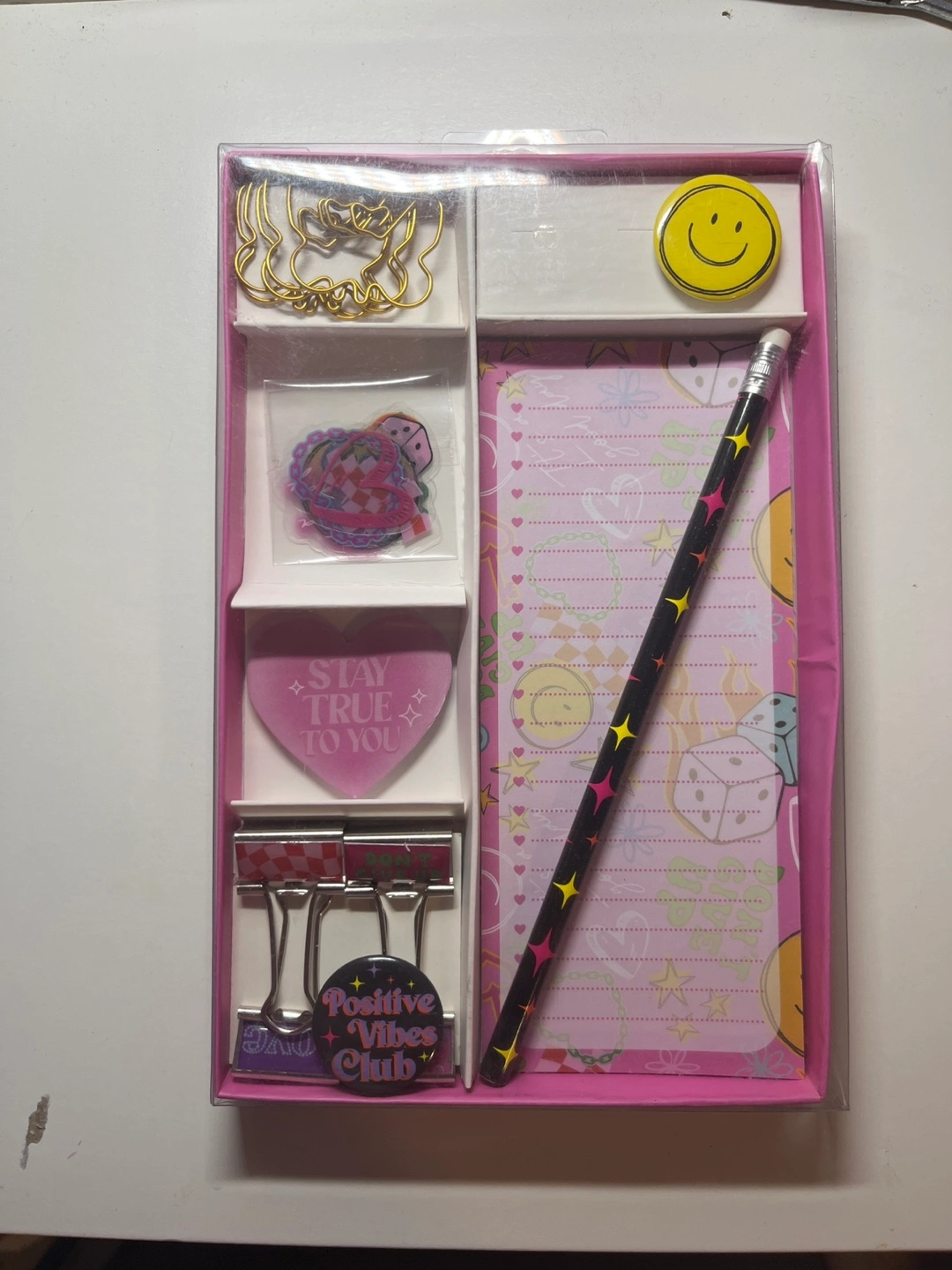 This Positive Vibes Club stationery set is brand new and ready to brighten up your desk! It includes a variety of fun items to keep you organized and inspired. Perfect for adding a touch of positivity to your everyday tasks